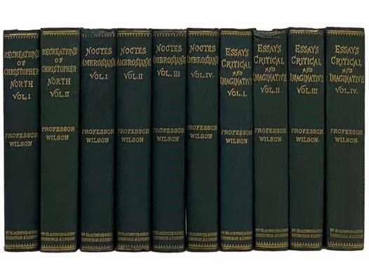 Edinburgh: William Blackwood and Sons, 1868. Second Edition. Hard Cover. Very Good/No Jacket. Second edition in book form. Front and end matter and edges foxed, Gratwick bookplate on front endpaper of each volume. 1868 Hard Cover. Complete in ten volumes. Dark green blind-stamped pebbled cloth, gilt titles and rules. Collected works of the University of Edinburgh professor of moral philosophy, who was friends with Thomas de Quincey, William Wordsworth, Samuel Taylor Coleridge, and Robert Southey. The writings are a mix of literary and intellectual discussions, and often use pseudonyms representative of Wilson's contemporary (e.g., Wilson himself is Christopher North, and 'The Ettrick Shepherd' represents James Hogg). Wilson was a regular contributor to Blackwood Magazine, and while much of the content included here was originally printed there, the articles, colloquies, and essays have 'been revised and considerably remodelled' from the magazine versions. The ten volume set comprises three separate sets, which were originally released in book form between 1842 and 1856.