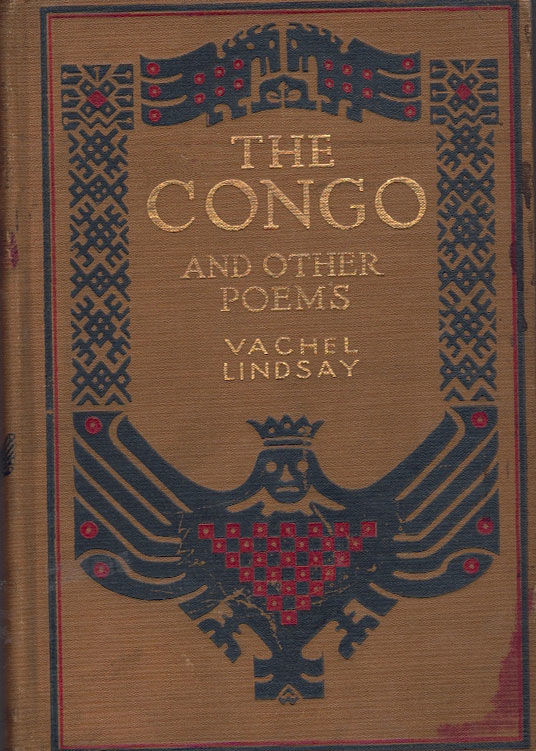 New York: The Macmillan Company, 1915. Reprint. Hardcover. Very good -. INSCRIBED. 159pp. Small octavo [19.5 cm] Yellowish brown cloth covered boards with gilt stamped titles and decorative red and blue ink stamped designs on the front cover. There are several ink stains on the front cover, most notably a 3 cm long red smudge on the front cover near bottom corner. Spine slightly rolled, corners bumped and scuffed. Inscribed by the author in black ink on front free end paper, "Merry Christmas- this year- next year- and every year better- is my wish for Miss Harriet [?] -- Sincerely, Nicholas Vachel Lindsay. Springfield, Illinois, December 25, [1917?]".
