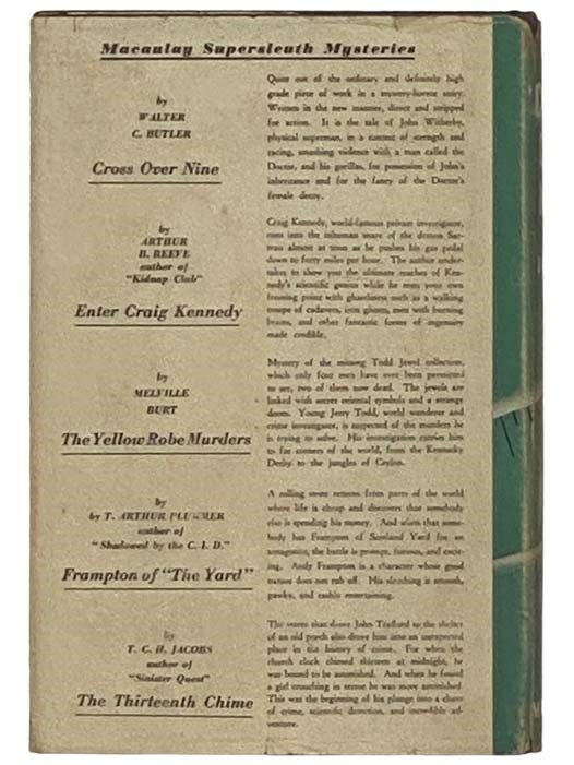 New York: The Macaulay Company, 1935. First Edition. Hard Cover. Very Good/Very Good. 0x0x0. First edition. Jacket edges rubbed with minor loss from corners, toned tape repairs on reverse of jacket spine head and foot, minor scuff on front board. 1935 Hard Cover. 255 pp. First mystery, and one of only two using this pseudonym, by Frederick Faust, who also wrote under the pen name Max Brand. From the half-title page: "It is the tale of John Witherby, physical superman, in a contest of strength and racing, smashing, violence with a man called the Doctor, and his gorillas, for possession of John's inheritance and for the fancy of the Doctor's female decoy. Savage and brutal without let-down, it casts a rare spell." From the jacket flap: "It is a favorable sign in a murder mystery if the author has refrained from the use of any secret underground passage and of any sly and slinking Orientals. That means a suspicion that the mystery has originality. And originality is the feature that first flashes at you out of the pages of Cross Over Nine.