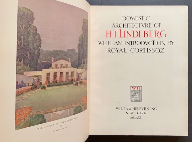 New York: William Helburn, 1940. 1/4 leather. Very Good. The 1940 1st edition, limited to 1,000 copies, of this lavish monograph on the work of American architect H.T. Lindeberg (1879-1959). Solid and VG in its 1/4 red leatherette over red cloth. Limited wear at the tips (down to the boards), mild wear along the spine ends and light scuffing to the rear panel. Still though, very presentable and internally, clean as could be, with no writing or markings of any kind. Crisp, captioned black-and-white photos --or the occasional floor plan-- along each verso and recto. Introduction by the American art critic Royal Cortissoz, who was the art critic for the New York Herald Tribune for almost 60 years, from 1891 until his death in 1948. Lindeberg was called by many the "American Lutyens" and specialized in opulent country houses.