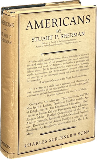 New York: Charles Scribner's Sons, 1924. Hardcover. Fine/Very Good. Early Printing. Fine in a Very Good jacket, unclipped ($2.00), generally toned and rubbed, a few small chips and tears at the edges. Green buckram with gilt lettering on the spine. Square and firmly bound, clean internally. A work about the American society and its literary tradition, with discussions of Whitman, Emerson, Mencken, Franklin, Jefferson, Carnegie, among others.
