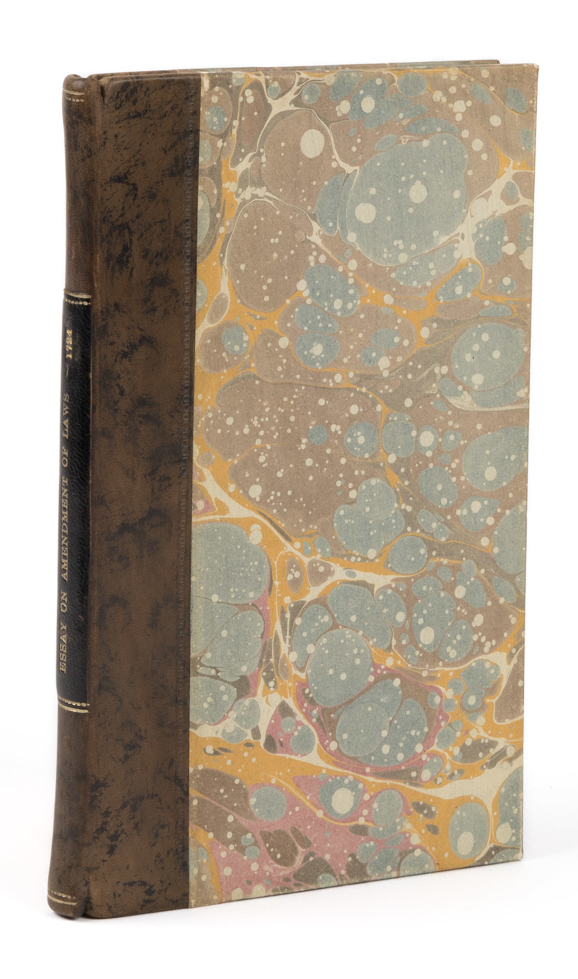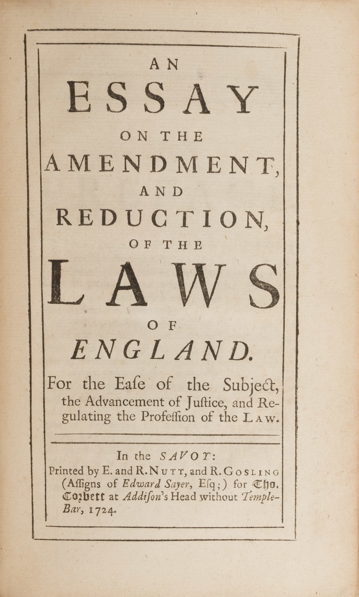 1724. Rare Eighteenth-Century English Tract on Law Reform [Law Reform]. [Great Britain]. An Essay on the Amendment, And Reduction, Of the Laws of England. For the Ease of the Subject, The Advancement of Justice, And Regulating the Profession of the Law. [London]: Printed by E. and R. Nutt, And R. Gosling (Assigns of Edward Sayer, Esq;) for Tho. Corbett, 1724. [iv], 63, [1] pp. Octavo (7-1/2" x 4-3/4"). Stab-stitched pamphglet bound into recent quarter calf over marbled boards, blind fillets running parallel to joints, gilt fillets and contrasting calf lettering piece to spine. Moderate toning to interior, faint dampstaining and some wear to fore-edges of final three leaves. $850. * Only edition as a separate work. Also issued as the second part of Law Quibbles (1st ed. 1724), this work is a substantial proposal to reform English law and the English legal profession. Clearly the work of an informed and responsible author, it influenced the work of the Society of Gentlemen Practisers, a professional society for attorneys and solicitors in England and Wales established in 1739. All editions of Law Quibbles are scarce; An Essay is rare. OCLC locates 2 copies (Franklin and Marshall College, Staatsbibliothek zu Berlin); the ESTC locates 1 (California State Library, Sutro Library). English Short-Title Catalogue (ESTC) N30349.