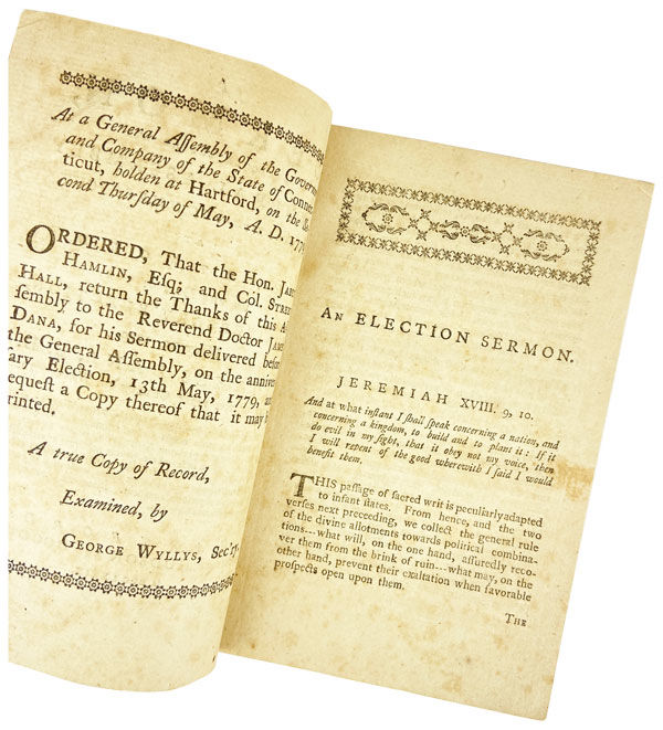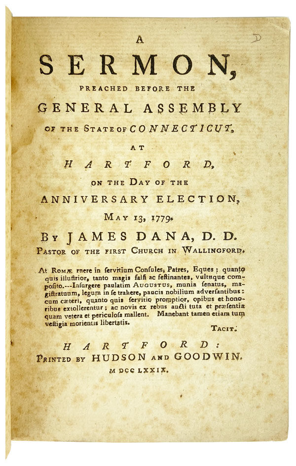 Hartford: Hudson and Goodwin, 1779. Very Good. Hartford: Hudson and Goodwin, 1779. First Edition. Octavo (18cm.); stitched self-wrappers, removed from larger volume; 46,[2]pp. ([A]4 B-F4, collated and complete with half title and errata). First and final leaf spotted, else Very Good and sound.