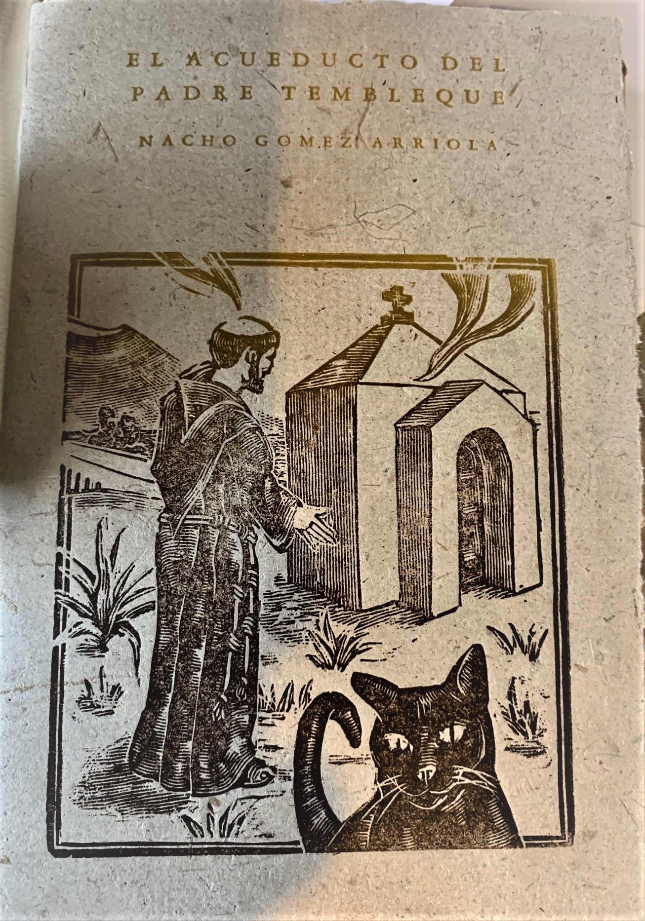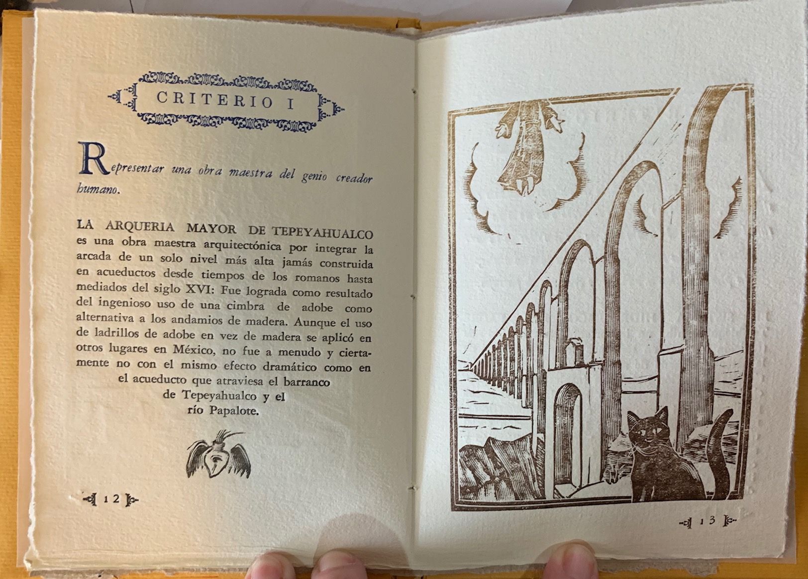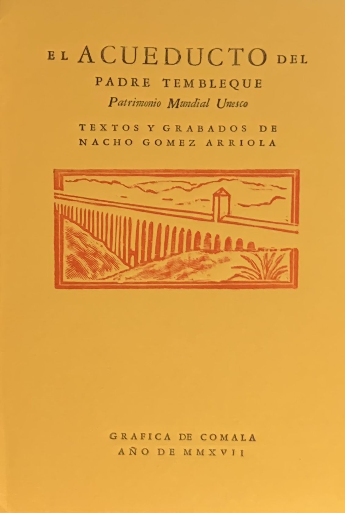 Guadalajara, México: Taller Gráfica de Comala, 2017. handmade letterpress book and paper, rice paper inserted, b/w plates, frontis., plan, elevation, typography prints, hardbound in orange cardboard covers with embossed motifs and title. COVER READS: "Acueducto del Padre Tembleque: Patrimonio de la Humanidad." SIGNED AND DATED, NUMBERED AND LIMITED EDITION OF 50 of hand-printed typographical Letterpress artists' book created in a Linotype machine by architect, restorer, writer, painter and sculptor Ignacio "Nacho" Gómez Arriola (b. Guadalajara, México 1955), founding member of the artisan printing workshop Taller Gráfica de Comala. A brief history and the main attributes of the “Aqueduct of Padre Tembleque Hydraulic System", inscribed in 2015 (39COM 8B.38) on the World Heritage List of UNESCO. CONTENTS: El acueducto del Padre Tembleque -- El valor cultural del acueducto -- Criterio I -- Criterio II -- Criterio IV.