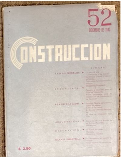 One of the only references to this publication: “Bajo una línea parecida, surgió en 1943 “Construcción, revista de ingeniería, arquitectura, arte, decoración e industria”. El apartado que se dedicó a urbanismo estuvo a cargo de Carlos Lazo, y a pesar del enfoque técnico de la revista, destaco el interés por lograr una integración más amplia. Lejos de los debates surgidos en la primera revista de principios de siglo -El Arte y la Ciencia- cuando las carreras de ingeniería y arquitectura se disputaban sus alcances, la revista “Construcción” nació insólitamente junto a las palabras “decoración, arte e industria” (Canales González, Ana Fernanda. La modernidad arquitectónica de México: a través de los medios impresos. Tesis Doctoral. [Madrid, Spain] : Universidad Politécnica de Madrid, Escuela Técnica Superior de Arquitectura de Madrid, 2013 --page 248. (https://core.ac.uk/download/pdf/148666108.pdf)_.