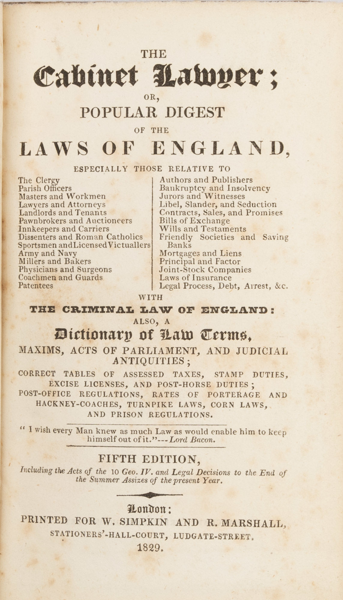 1829. Includes a "Dictionary of Law-Terms, Maxims, Acts of Parliament, And Judicial Antiquities" Wade, John [1788-1875]. The Cabinet Lawyer; Or, A Popular Digest of the Laws of England... With the Criminal Law of England: Also a Dictionary of Law Terms, Maxims, Acts of Parliament, And Judicial Antiquities; Correct Tables of Assessed Taxes, Stamp Duties, Excise Licenses, And Post-Horse Duties; Post-Office Regulations, Rates of Porterage and Hackney-Coaches, Turnpike Laws, Corn Laws, And Prison Regulations. Fifth Edition, Including the Acts of the 10 Geo. IV. And Legal Decisions to the End of the Summer Assizes of the Present Year. London: Printed for W. Simpkin and R. Marshall, 1829. xxviii, 676, [2] pp. Publisher advertisements to last 2 pp. 12mo. (6" x 3-1/2"). Original paper-covered publisher's boards, paper label to spine, edges untrimmed. Light rubbing to boards, moderate rubbing to extremities, front joint starting at head, rear joint starting at ends, light creasing to spine, which has a small chip near its foot, spine ends and corners bumped, corners lightly worn, front hinge starting at head, light foxing to preliminaries, small bookseller ticket to front pastedown, small ink annotation to rear pastedown. Light toning to interior, light foxing in a few places. $150. * This comprehensive layman's guide includes a "Dictionary of Law-Terms, Maxims, Acts of Parliament, And Judicial Antiquities" and an appendix listing general rules of the courts of common law, chancery and bankruptcy. Sweet & Maxwell, A Legal Bibliography of the British Commonwealth 2:368.