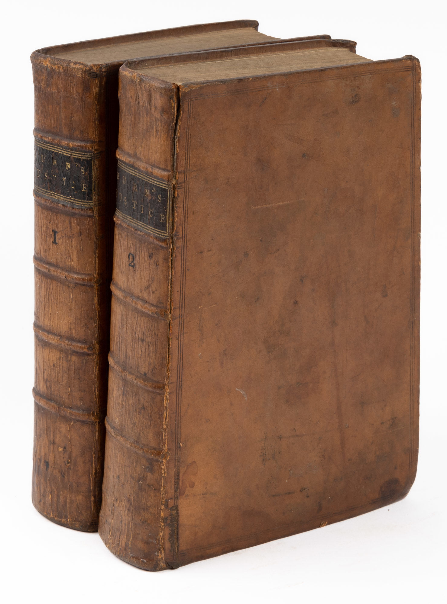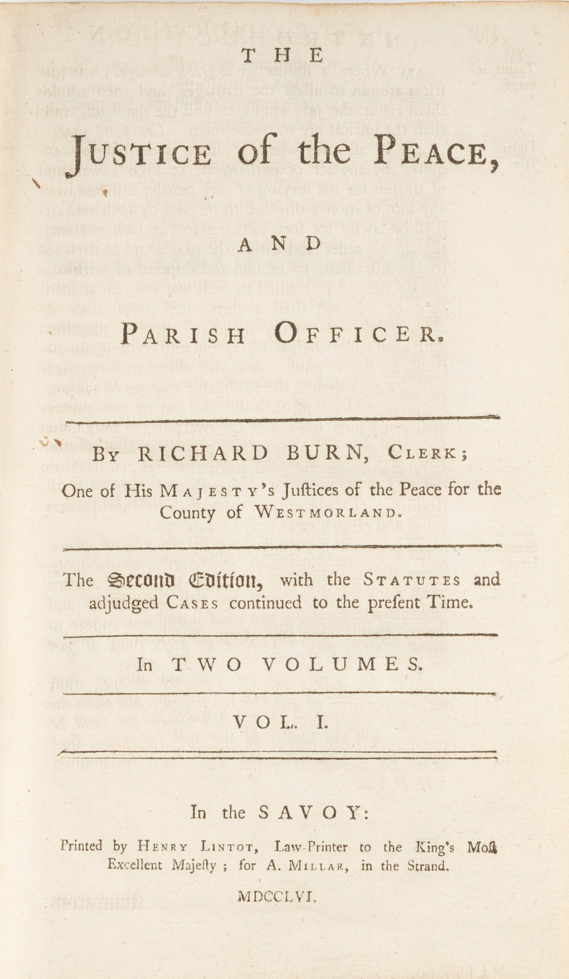 1756. 2 vols. 2nd ed, London, 1756. 2 vols. 2nd ed, London, 1756. Early Edition of Burn's Justice Burn, Richard [1709-1785]. The Justice of the Peace, And Parish Officer With the Statutes and Adjudged Cases Continued to the Present Time. [London]: Printed by Henry Lintot, 1756. Two volumes. xxiv, 576; 615, [1] pp. Octavo (8-1/4" x 51/4"). Contemporary calf, blind rules to boards, raised bands, lettering pieces and blind volume numbers to spine, blind tooling to board edges. Light rubbing and a few minor nicks, scuffs and spots to boards, moderate rubbing to extremities, front joint of Volume II cracked, corners bumped and somewhat worn. Light toning to interiors, early manuscript index to front endleaves of each volume. $850. * Second edition, the first with revisions. A durable work, Burn's Justice went through 30 editions by 1869 and was excerpted often in early American justice manuals, such as Parker's Conductor Generalis (1764) and Burn's Abridgment of Burn's Justice of the Peace and Parish Officer (1773). It covers such topics as Accessory, Alehouses, Aliens, Assault and Battery, Bail (By Writ of Habeas Corpus), Bankrupt, Bastards, Burglary, Clergy, Dogs, Evidence, Excise and Customs, Forgery, Game, Homicide, Jurors, Libel, Oaths, Insolvent Debtors, Polygamy, Promissory Notes, Rape, Riot, Robbery, Taxes and Vagrants. Holdsworth notes that "a perusal of these headings tells us something of the development of the system of local government" at the time when the book was written." Holdsworth, A History of English Law X:162. English Short-Title Catalogue T68628.