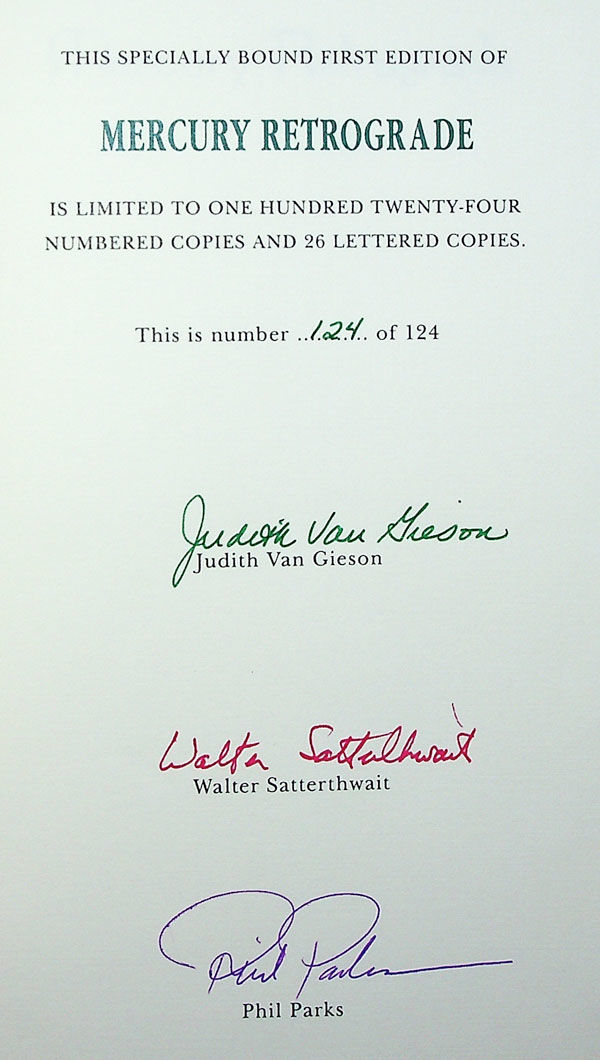 Huntington Beach: James Cahill Publishing, 1994. First, Limited Edition. One of 124 numbered copies specially bound and signed by all three contributors, this being copy no.124. Octavo (23.75cm); glossy pictorial paper-covered boards and green cloth backstrip, with titles stamped in gilt on spine; publisher's matching cloth slipcase; [2],x,82,[4]pp. Fine in a Fine slipcase. Collection of short fiction and poems by the Southwestern mystery author.