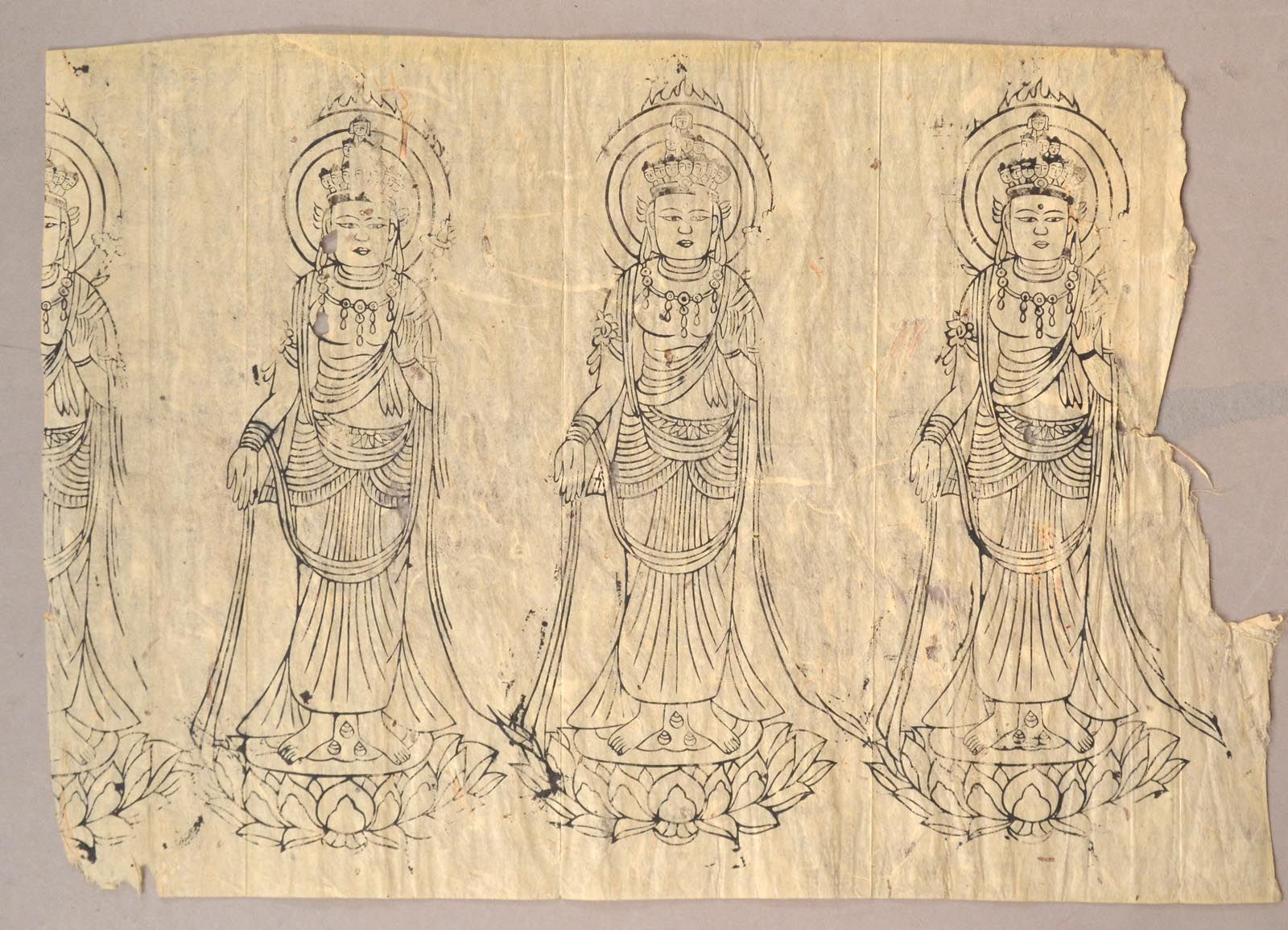 The unprinted margin on the right hand side of the paper is torn but the image is intact. There are a few small holes. Very clear impressions. Important both for the history of Buddhist art and the world history of illustration as well.