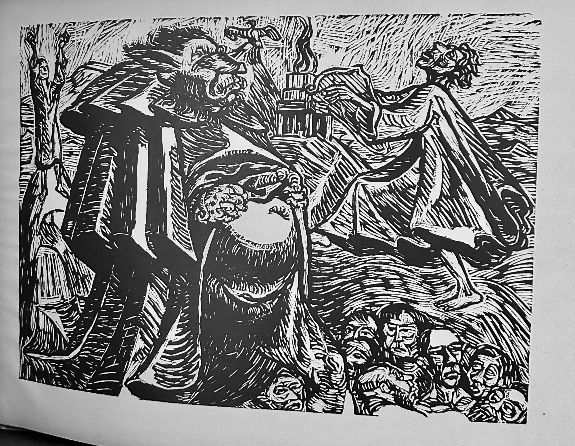 Berlin: Paul Cassirer, 1922. First edition. Hardcover. Orig. illustrated brown boards. Very good. 31.5 x 45 cm. Seven full page woodcuts. Barlach, an outstanding sculptor of the Expressionist movement whose style has often been called “modern Gothic.” Influenced early in his career by Jugendstil, Germany’s Art Nouveau style, he vacillated between pursuing sculpture and the decorative arts. His work removed from German museums under the Nazi regime and categorized as “degenerate art." Printed at the Pan-Presse. Text in German.