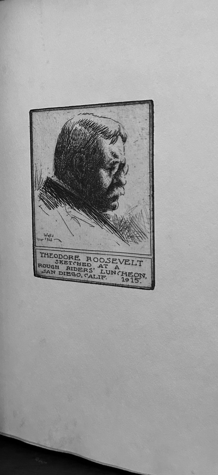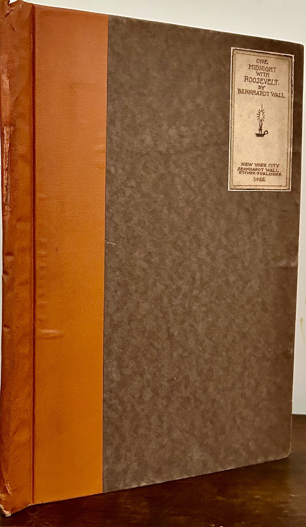New York: Bernhardt Wall, 1922. First edition. Hardcover. Orig. light tan cloth and brown boards, front cover paper label. Very good. Unpaginated. 28 x 21 cm. Eighteen etched plates in colored inks on wove paper with tissue guards. Signed by Wall, copy 7 of 250. Bernhardt details his delightful evening accompanied by Admiral Charles D. Sigsbee and Monsignor John P. Chidwick (commander and chaplain of the battleship Maine) had with Theodore Roosevelt on Decoration Day, 1917, at Oyster Bay -- WEBER. p.32. One etching of Roosevelt herein "Sketched at a Rough Riders' Luncheon, San Diego, Calif. 1915." Interior bright and fresh. Wall wrote, designed, printed, cut, sewed, and bound many of his books himself including this one. Spine slightly rubbed toward head.