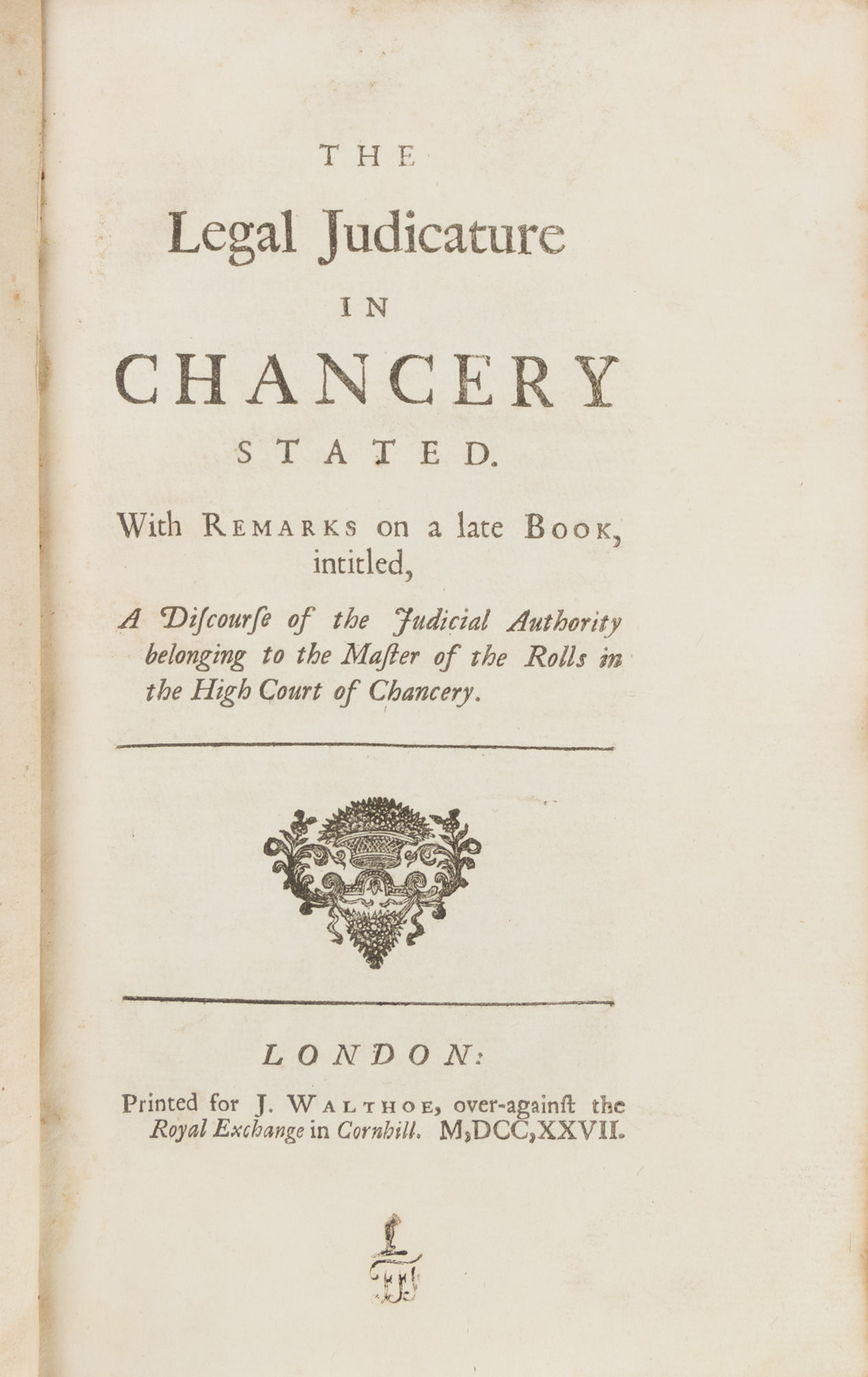 1727. London, 1727.. London, 1727. The Rank of Judges in the Court of Chancery [Burroughs, Samuel (d.1761)]. The Legal Judicature in Chancery Stated. With Remarks on a Late Book, Intitled, A Discourse of the Judicial Authority Belonging to the Master of the Rolls in the High Court of Chancery. London: Printed for J. Walthoe, 1727. 282 pp. Lacking 4 pp. publisher catalogue. Octavo (8-1/2" x 5-1/4"). Contemporary calf, gilt frames to boards, rebacked and recornered in period style with gilt-edged raised bands and lettering piece to spine, gilt tooling to board edges, edges of text block rouged. Light rubbing to boards, moderate rubbing to extremities, front joint starting at ends, rear joint starting at head, light creasing to spine, which is chipped at head, corners bumped and lightly worn, hinges cracked, light foxing and faint offsetting to endleaves. Light toning to interior, negligible light foxing and soiling to several leaves, corrections in an early hand in a few places. $450. * Only edition. This book is a response to a point in A Discourse of the Judicial Authority Belonging to the Office of Master of the Rolls in the High Court of Chancery (1727) by Philip Yorke, Earl of Hardwicke. Burroughs believes Yorke is incorrect when he stated that the Chancery court was directed by two judges that are not "co-ordinate, but in a subordination of one to the other" (3). Ultimately, Burroughs's view triumphed and the Master of the Rolls gained statutory independence. English Short-Title Catalogue T95693.
