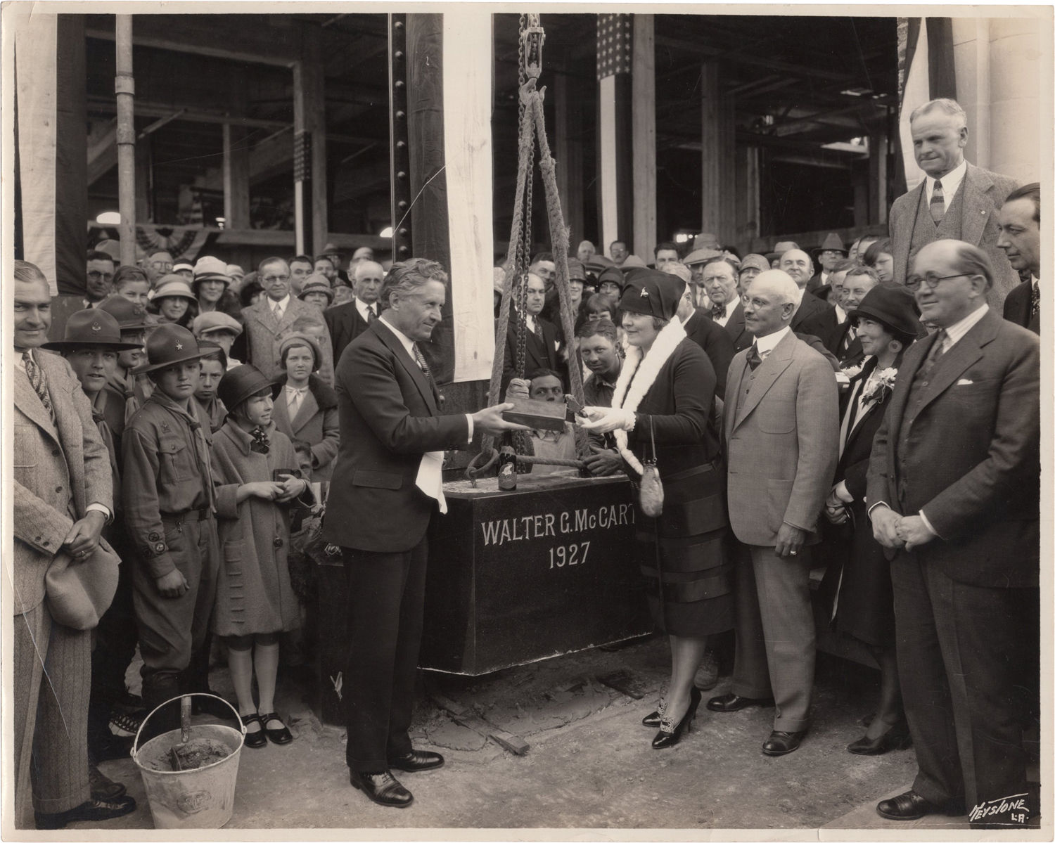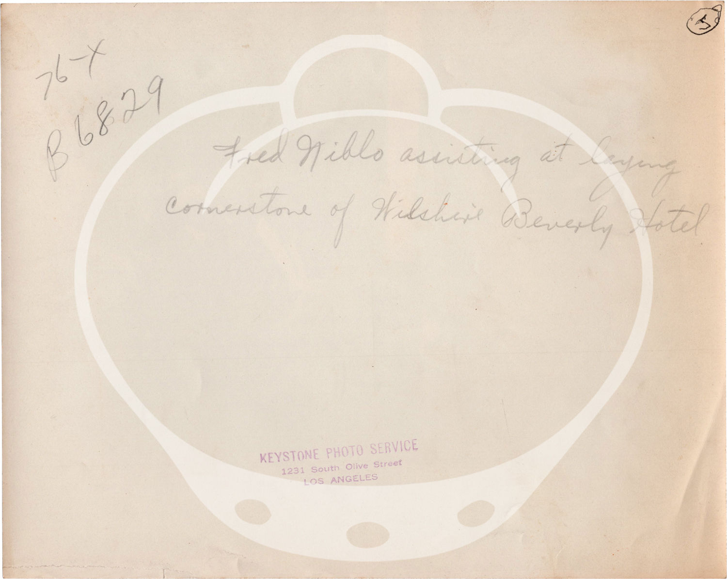 N.p.: N.p., 1927. Vintage photograph of director Fred Niblo at the cornerstone-laying ceremony for the Beverly Wilshire Hotel on April 16, 1927. Stamp of Keystone Photo Service in Los Angeles on the verso, and with Keystone's insignia from the negative on the bottom right corner of the recto.