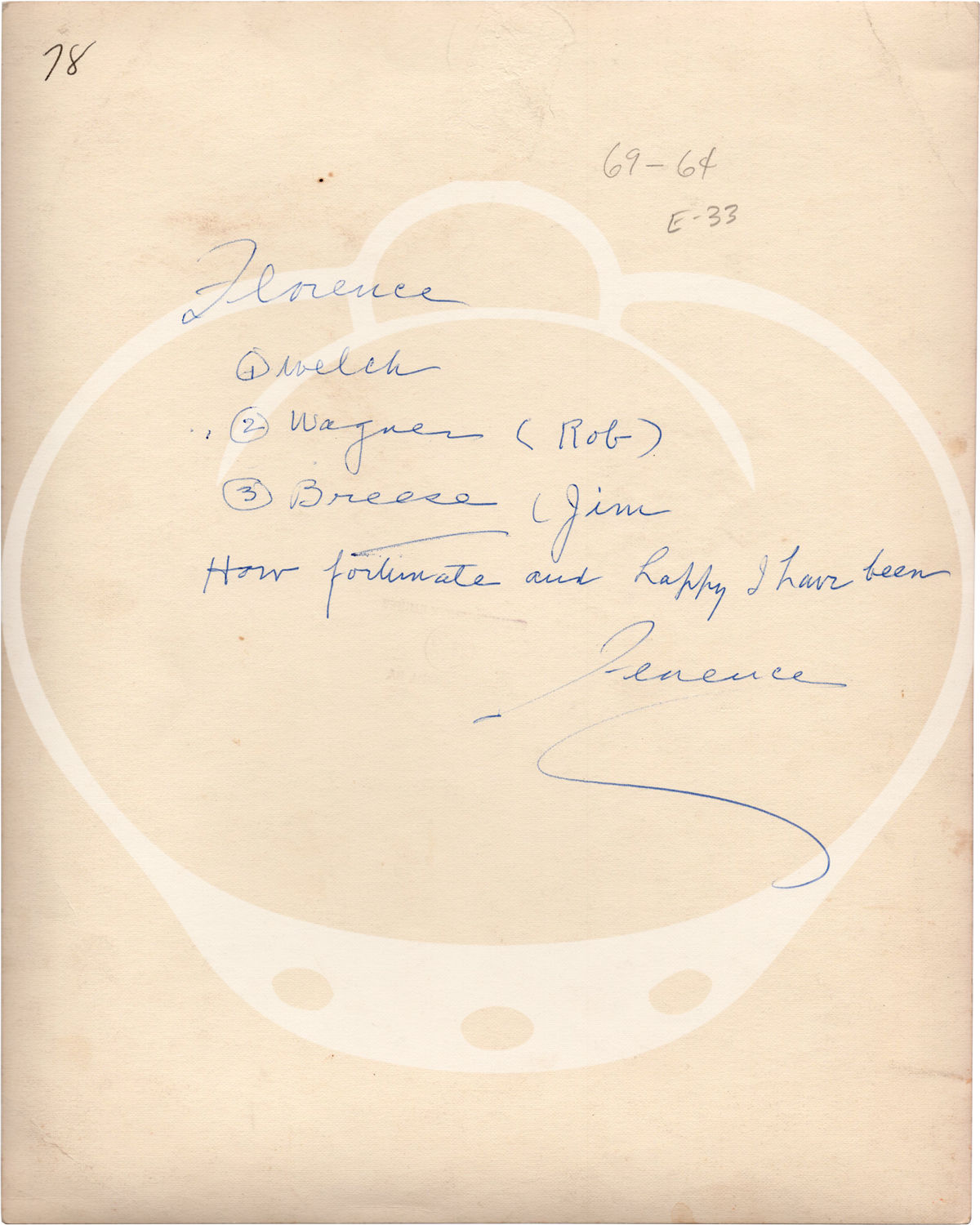 N.p.: N.p., 1940. Vintage portrait photograph of newspaper reporter, screenwriter, and progressive rights advocate Florence Welch, circa 1940s. Annotations in Welch's hand on the verso: "Florence / 1. Welch / 2. Wagner (Rob) / 3. Breese (Jim) / How fortunate and happy I have been / Florence."