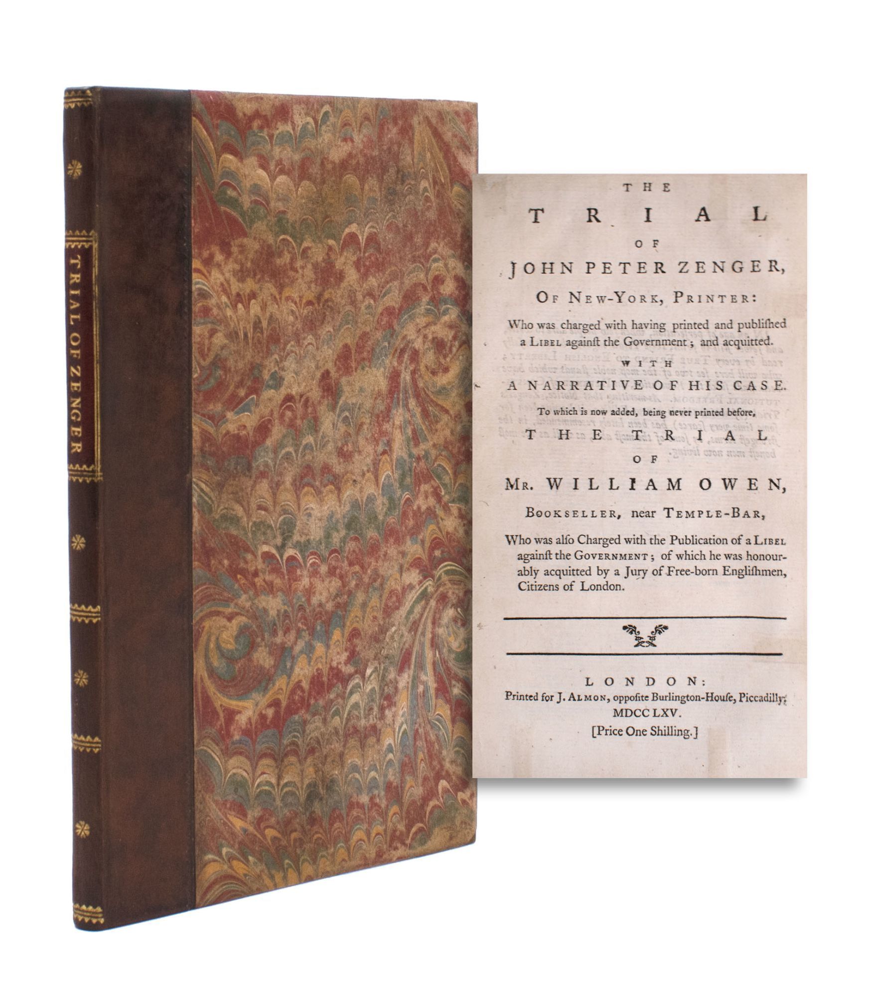 In 1733, John Peter Zenger published articles critical of the New York colonial Governor William Cosby in his newspaper, the New York Weekly Journal and was charged with libel. Represented by Andrew Hamilton and William Smith, Sr., the trial is particularly notable as the first use of truth as a defense against libel. The account of the trial was first published in New York in 1736, with various editions published in America and Great Britain in 1738. All early edition are very rare. The present later edition includes an account of a similar trial in Britain. ESTC T51691; Howes Z6; Sabin 106311