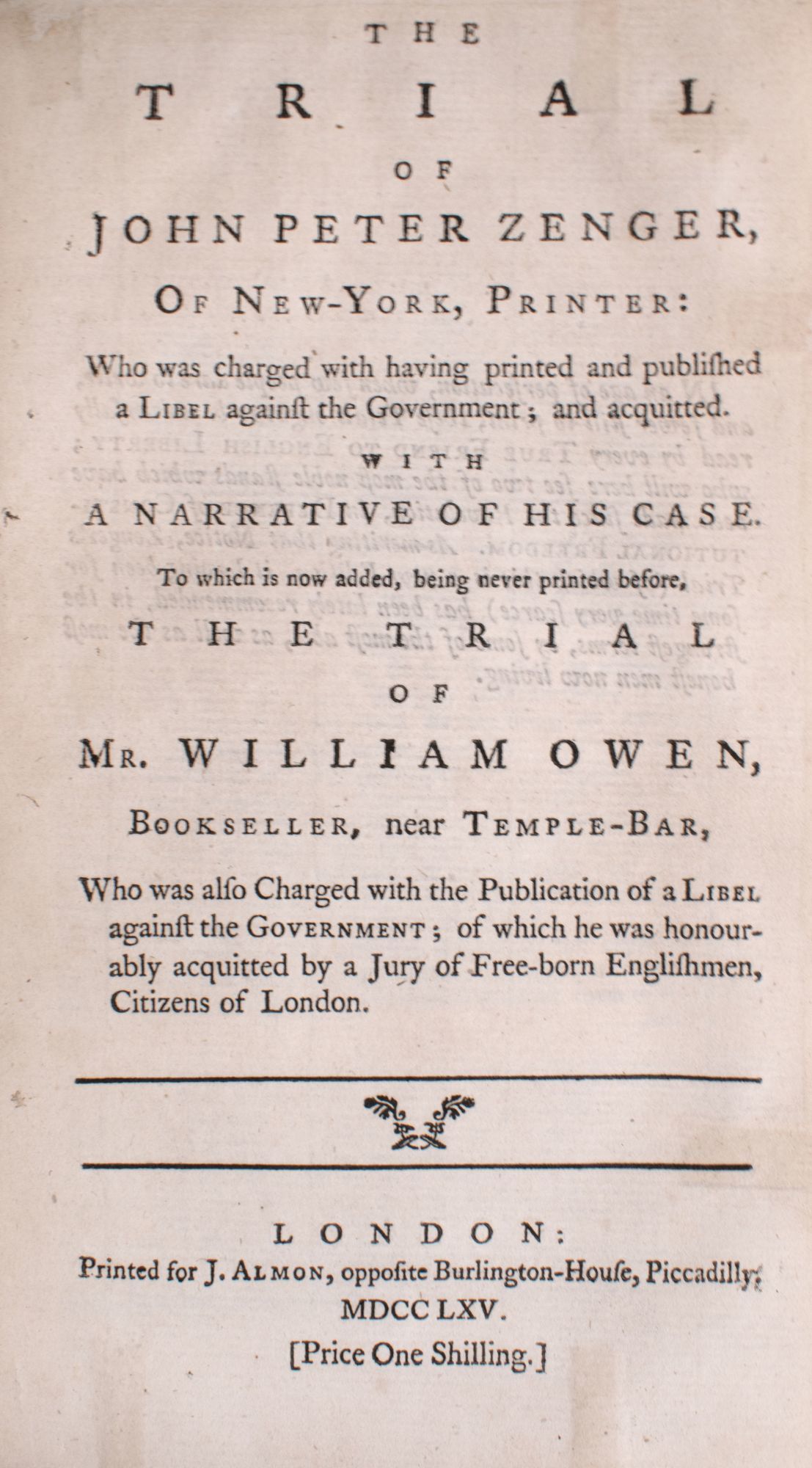 The Trial of John Peter Zenger, of New-York, Printer: Who was charged with having printed and published a libel against the Government, and acquitted. With a Narrative of his Case. To which is now added, being never printed before, the Trial of Mr. William Owen, Bookseller, near Temple-Bar, Who was also Charged with the Publication of a Libel against the Government