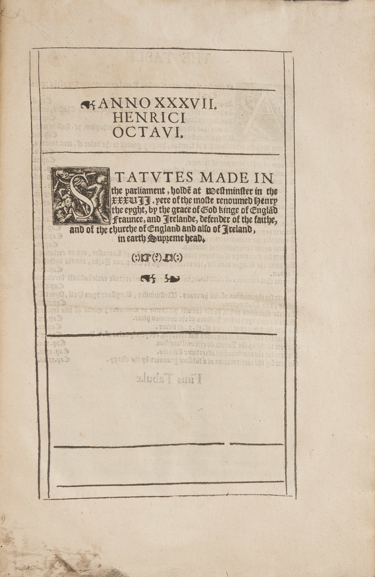 1575. Acts of Henry VIII, 1545 [Great Britain]. [Statutes]. Henry VIII [1491-1547], King of England. Anno XXXVII. Henrici Octavi. Statutes Made in the Parliament, Holde[n] at Westminster in the XXXVII. Yere of the Most Renoumed Henry the Eyght, By the Grace of God Kinge of Engla[n]d Fraunce, And Irelande, Defender of the Faithe, And of the Churche of England and Also of Ireland, In Earth Supreme Head. [London: Printed by Thomas Marsh, 1575?]. [72] pp. Folio (11-1/4" x 7-1/2"). Later (twentieth-century) quarter cloth over marbled boards, blind fillets to spine, endleaves renewed. Light rubbing to spine ends and board edges, corners negligibly worn, later pencil notations to front pastedown and free endpaper. Light toning, slight horizontal creases and faint dampstaining to interior, light soiling in a few places. $1,750. * Later edition. Twenty-four acts passed during the thirty-seventh year of the reign of King Henry VIII. Among the more interesting acts are acts dealing with ecclesiastical jurisdiction and houses of worship, an act against making false accusations of treason, and an act against usury, which fixed the maximum allowable interest rate at ten percent for the first time. Beale, A Bibliography of Early English Law Books S214. English Short-Title Catalogue S121478.