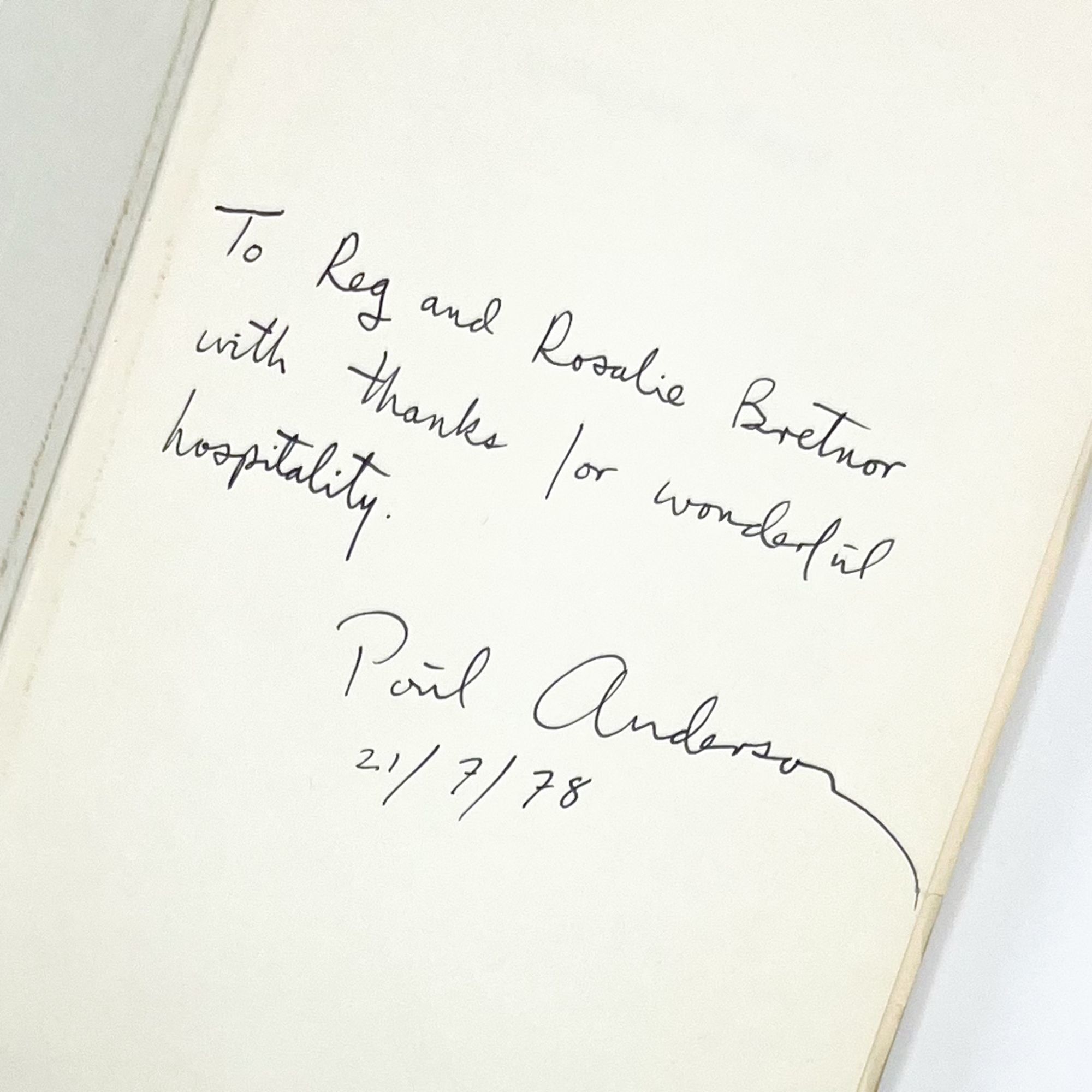Garden City, NY: Doubleday & Company, Inc, 1974. Fine in near fine jacket.. First edition of Anderson's alternate-history Shakespearian fantasia with elves, warmly inscribed to fellow science fiction writer Reginald Bretnor and screenwriter Rosalie (Bodrero) Bretnor. 8'' x 5.5''. Original blue cloth. In original unclipped ($5.95) dust jacket by Tim Lewis. 207, [1] pages. Inscribed by Anderson on front free endpaper: "To Reg and Rosalie Bretnor with thanks for wonderful hospitality. Poul Anderson 21/7/78." Minor scuffing to boards at extremities. Offsetting to endpapers. Light edgewear, faint chipping and soil to jacket.