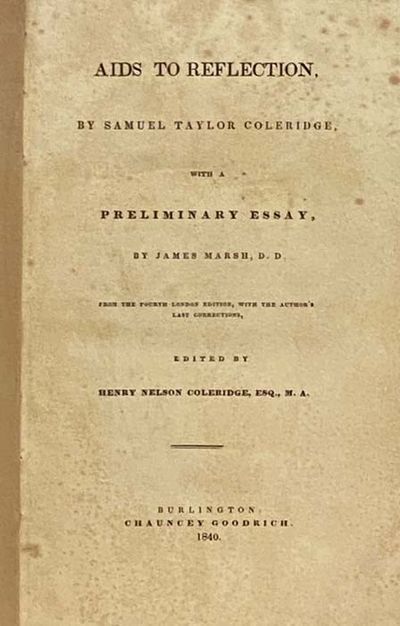 Burlington: Chauncey Goodrich, 1840. Reissue. Hard Cover. Good/No Jacket. 0x0x0. Reissue of 1825 work first published in the United States in 1829, from the fourth London edition, with the author's last corrections. Spine faded, foxed throughout, owner blind stamp on first two pages. 1840 Hard Cover. 357 pp. 8vo. Purple cloth, gilt titles, blind-stamped borders and decorations. After its publication in the U.S., this work was a force in the popularization of American Transcendentalism, largely due to contributor James Marsh, who energetically promoted it. Coleridge was, of course, best known for his poetry, most notably the oft-misquoted The Rime of the Ancient Mariner. His works The Friend and Essays on the Principles of Methods influenced John Stuart Mill, Ralph Waldo Emerson, and others. The Friend first appeared originally as a serialized journal, and included contributions by William Wordsworth and John Wilson (who wrote under the name Christopher North). "Commentators always had difficulty in characterizing the special nature of Coleridge's achievement: indeed, his true legacy lay, perhaps, in the creativity he awakened in those he met. Lamb, Wordsworth, Hazlitt, De Quincey, Byron, and Keats, touched by him in turn, each manifested the effects in the quality of their writing... Thinkers such as these produced what came to be known as the broad-church movement, and in some cases the beginnings of Christian socialism. Across the Atlantic, in the same years, Coleridge's influence, while affecting writers such as Emerson and Poe, was most strongly felt in religious and theological fields, particularly in New England and Vermont." (Oxford Dictionary of National Biography)