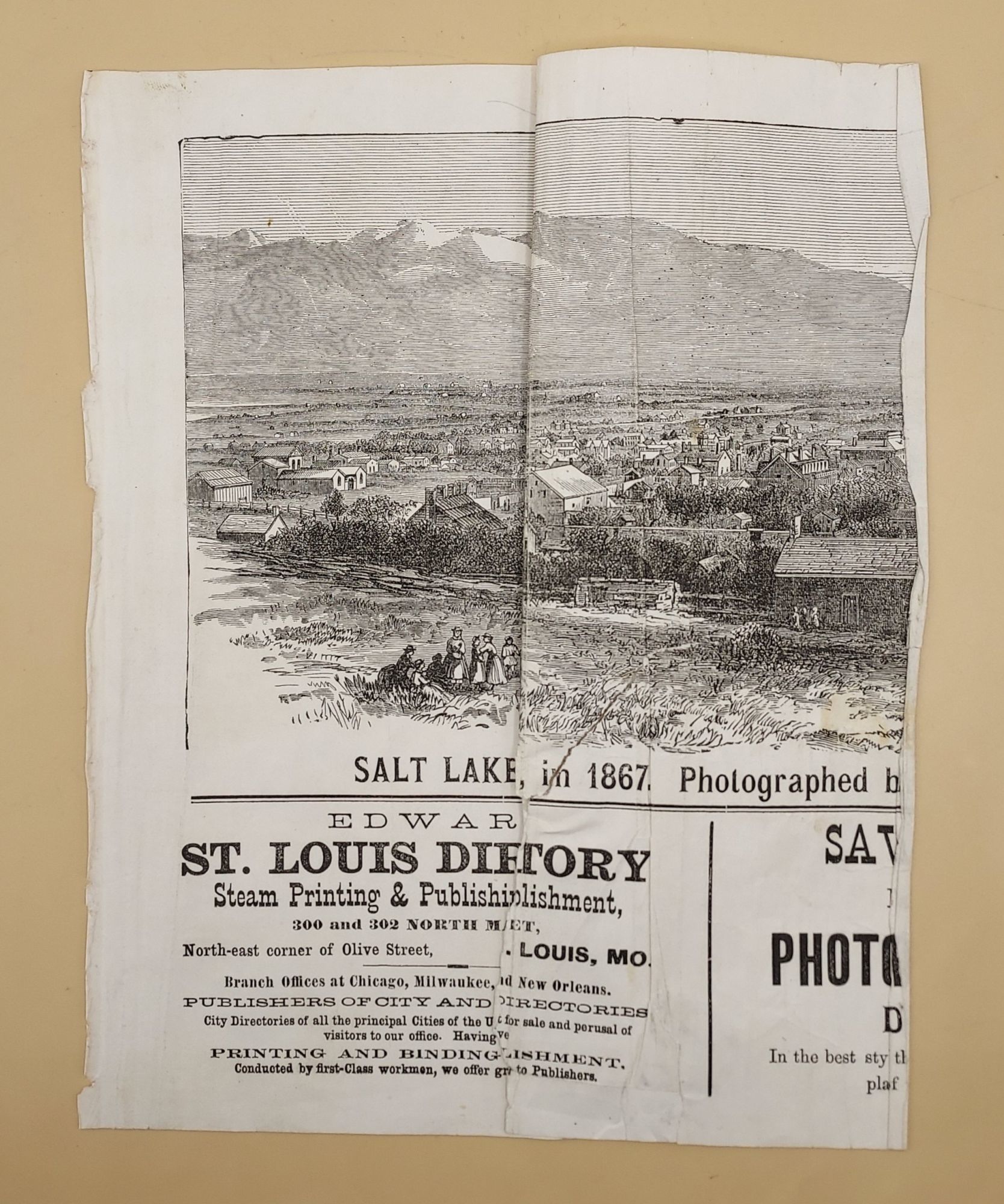Salt Lake City, UT: E. L. Sloan & Co, 1869. First edition. Hardcover. Good. 57-219pp Octavo [23 cm] Rebacked in modern cloth with original paper labels with advertisements to the boards (the boards have been professionally restored at the edges). Japanese tissue repair to front hinge. A small portion of the original spine bound in at the rear. ***Missing pp. 97-112. Pp. 113-128 bound in twice. Boards scratched. Minor moisture stains in the fore-edge margins of the preliminary leaves. The folding 'Plat of Salt Lake City' is present and laid in. With 1/4 of the Bird's Eye View tucked in as well (backed with several pieces of tape). Flake 7757. This is the first directory for Salt Lake City printed in Salt Lake City, and is uncommon. This work opens with a brief history of Mormonism [p.56-58], followed by a chronological list of events in Utah (beginning with the arrival of the Mormon pioneers in 1847) [p. 59-64]. This is followed by a section that contains an overall look at the Territory of Utah at the time, including; history, mining, social organizations, federal officers, local governments, public buildings, schools, cemeteries, churches, post offices, newspapers, etc. [p.65-85]. This is followed by the directory of Salt Lake [87-173]. This followed by a brief history of the Union Pacific Railroad [182-187]. The remainder of this work is dedicated to Chicago [Ill.], and is titled: 'Chicago: Its Growth and Trade' this includes a brief history and overview and ends with a directory of Chicago businesses (including advertisements).