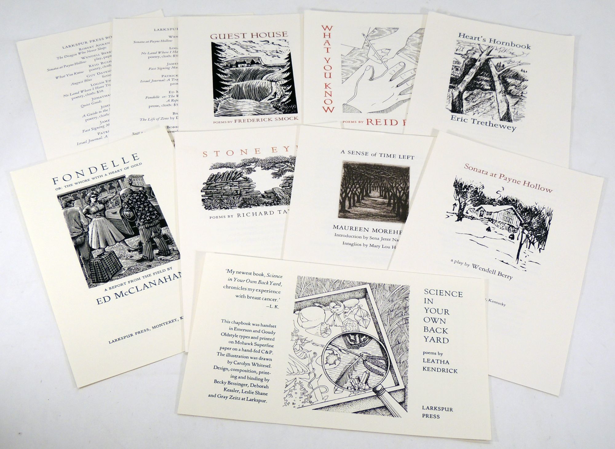 Monterey, KY: Larkspur Press. Paperback. Fine. Paperback. Includes prospectuses for: Guest House, Fondelle, Stone Eye, A Sense of Time Left, Sonata at Payne Hollow, Heart's Hornbook, What You Know, Science in Your Own Back Yard, and 2 price lists. Each prospectus is either two pages (a single leaf printed front and back) or four pages (two leaves printed front and back). Illustration printed on each prospectus. Clean and bright. Size: most are about 9 x 6 inches. PRI/032323.