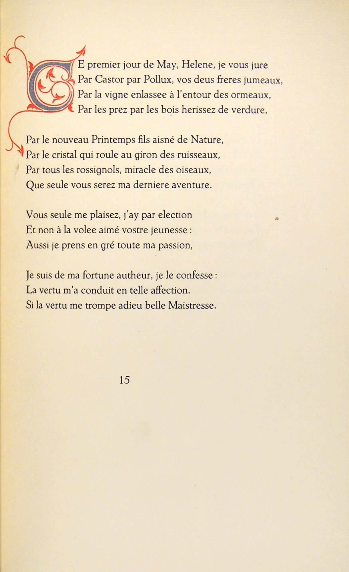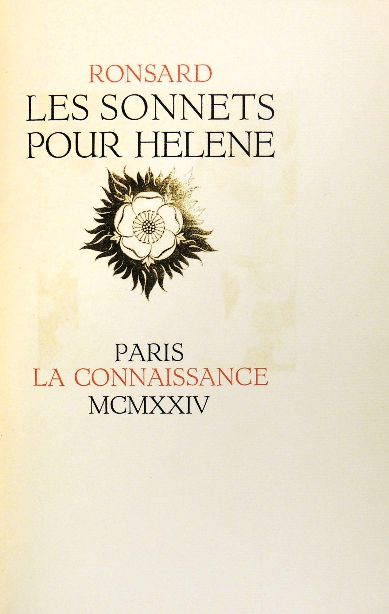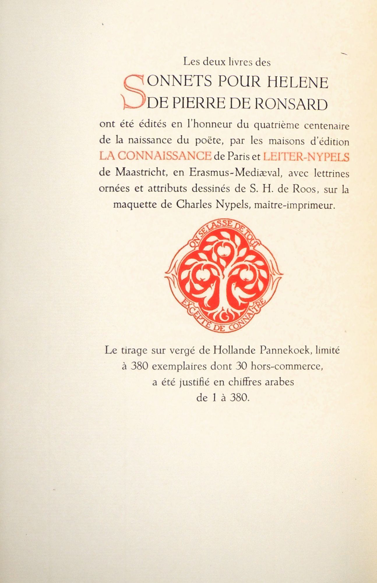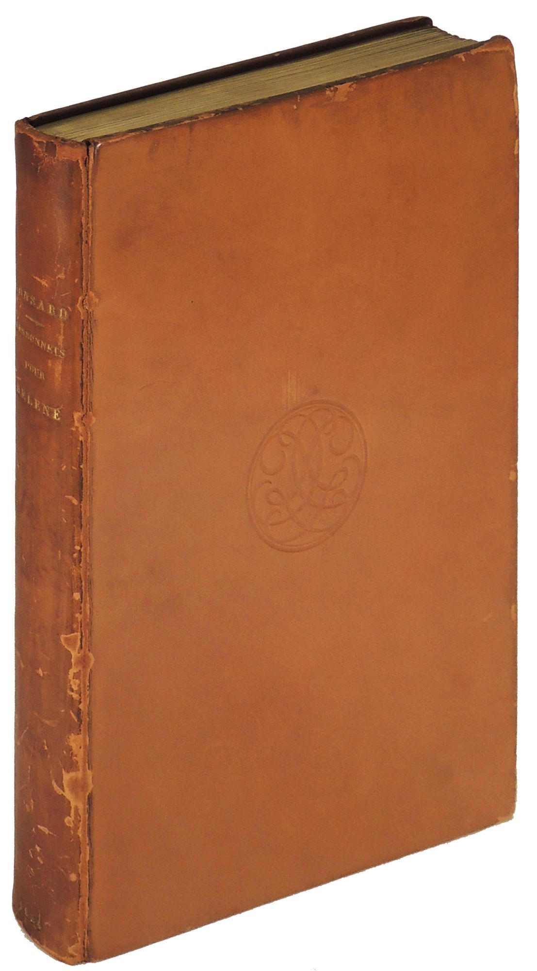 Paris and Maastricht: La Connaissance and Leiter-Nypels, 1924. Hardcover. Very Good. Hardcover. Number 308 of 380 copies. Printed to honor the 400 year anniverasary of the birth of the author, Pierre de Ronsard (1524 - 1585). Bound in full tan leather boards with gilt title to spine and blind stamped devices to both boards. Rubbing and chipping to leather along hinges, corners, and edges of boards. The leather along both hinges is starting to crack, but the boards remain firmly attached and the cords remain unbroken. Gilt decoration to dentelles. Marbled endpapers with top edge gilt. Printed on fine paper in Erasmus-Mediaeval type with initial letters and decorations by S.H. de Roos. With a lovely color frontispiece engraving. Gilt flourish to title page. Printed in black, red, and blue inks. The original blue paper wrappers are bound in. Clean and bright aside from penned gift inscription to front free endpaper, offsetting to title page, and browning to top margins of two facing interior pages - likely due to a laid in bookmark that has since been removed. A beautiful printing of these classic sonnets. 183 pages. PRI/032323.