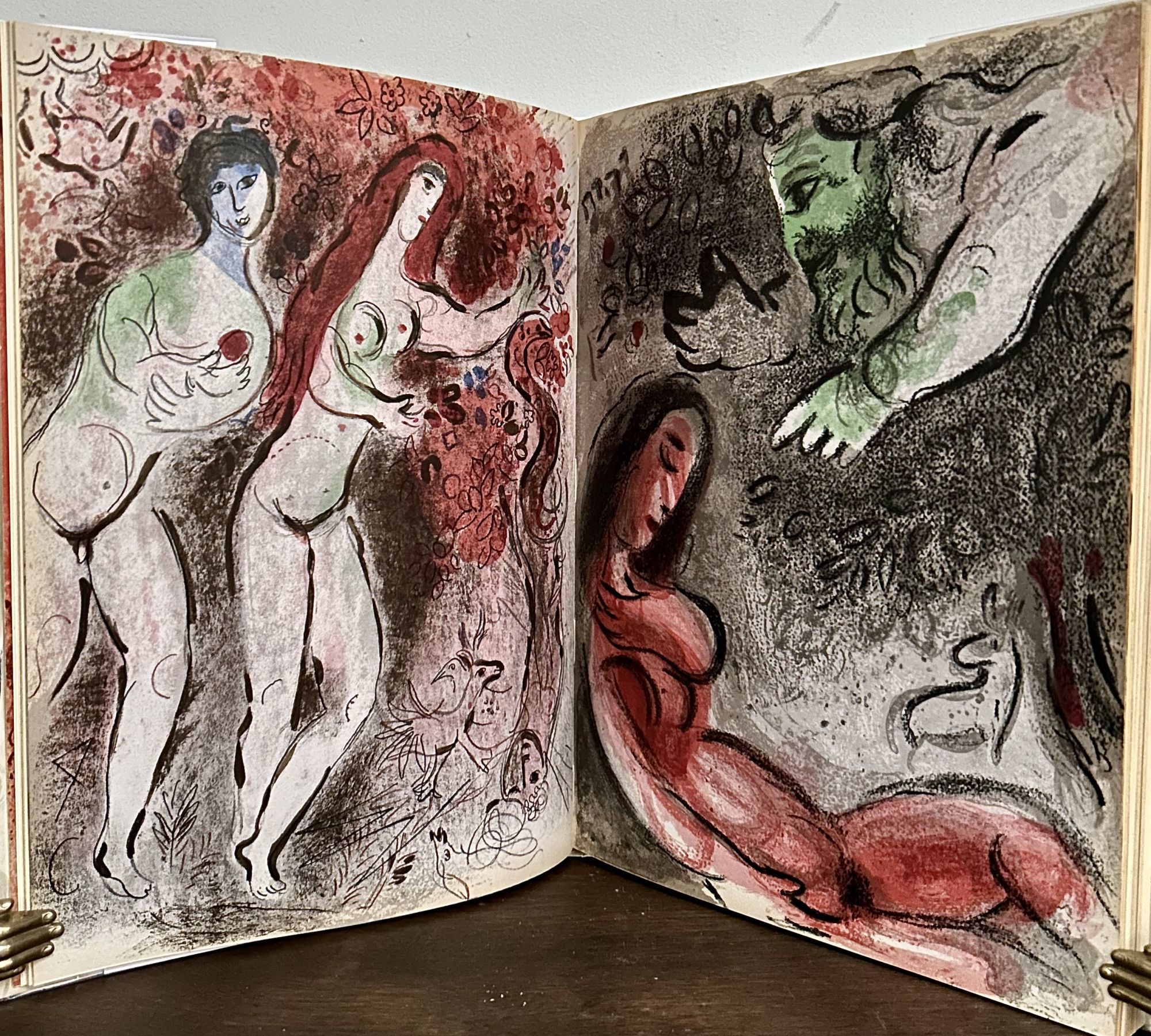 New York: Harcourt Brace and Company, 1980. First American edition. Hardcover. Orig. color lithographed boards. Near fine in original unclipped dust wrapper chipped along the edges. Introductory text not paginated (seven leaves). 37 x 27 cm. Twenty four full page original color lithographs, plus 96 plates in black and white. Chagall's biblically theme drawings first reproduced in Verve 33/34 and the second suite Verve 37/38 (double issue), Summer 1960 and is the final entry in the Verve bibliography. The heliogravures in black and white printed by Draeger Freres, and the color lithographs by Mourlot Freres. CRAMER 42. MOURLOT 230-277. SORLIER 75.