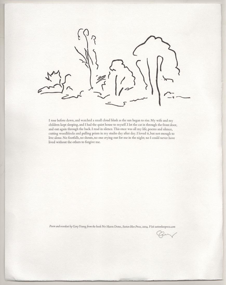np: Sutton Hoo Press, 2004. First edition. Broadside that measures 11.25" wide by 14.25" high. Features a short poem and a woodcut illustration by Young. A near fine copy with some slight creases to the corners. Signed by Young. Scarce, with no copies listed in OCLC.