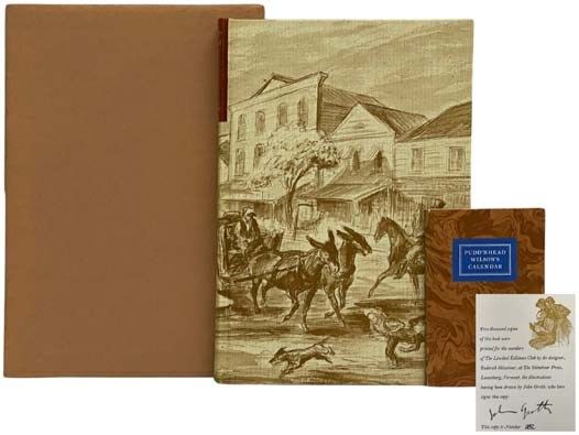 Avon: The Limited Editions Club, 1974. Limited Edition. Hard Cover. Near Fine/Very Good. 0x0x0. Groth, John. Signed by illustrator. Limited edition, #1182 of 2000 copies. Includes publisher's slipcase, onion skin jacket, and softcover calendar. Signed by illustrator and hand-numbered on limitation page. Jacket toned with minor loss along edges. 1974 Hard Cover. xiii, [5], 164; 39 pp. 8vo. Introduction by Edward Wagenknecht, illustrations to the original text and the calendar by John Groth. "First serialized in The Century Magazine between 1893 and 1894, Mark Twain's Pudd'nhead Wilson is a murder mystery set before the American Civil War in Missouri, more specifically, on the Mississippi River. During infancy, a light-skinned black baby and a white-skinned baby were switched at birth by a slave mother. Because the black baby grows up thinking he is white, he is highly racist toward his slaves. The white baby, who thinks he is a slave, grows up with no guidance and makes a living stealing, drinking, and doing other immoral things. During a murder trial, the town lawyer Puddn'head Wilson, who is seen as a peculiar fellow by the townsfolk, is able to expose the boys' true identities. Puddn'head Wilson is a story carried by themes of racism, Southern customs, and questions of identity. On the surface it is a witty and satirical tale but as one digs deeper a biting social commentary of racial inequality can be found.