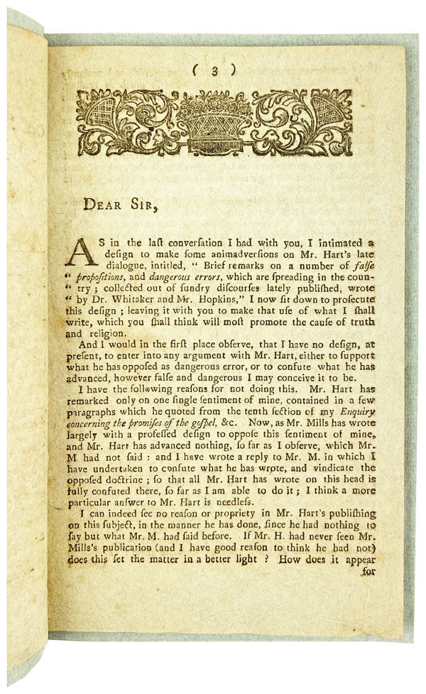 Response to William Hart's pamphlet "Brief Remarks on a Number of False Propositions," by Samuel Hopkins (1721-1803), a leading disciple of Jonathan Edwards. Quite uncommon, none in the trade as of March, 2023, and last seen in the auction record in 1962.