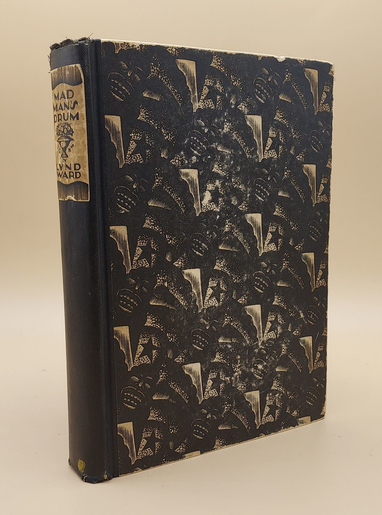New York: Jonathan Cape and Harrison Smith, 1930. First trade edition (published simultaneously with signed limited edition). Hardcover. Unpaginated (258 pp). Printed and bound by Plimpton Press, Norwood, MA. Octavo. Black and white pictorial paper over boards. Paper label on spine. Lacking dust jacket. Very good minus. Rubbed edges and worn corners. Spine is cocked and with a small spot of discoloration near bottom edge. Binding is firm. Previous owner’s name inside. Interior otherwise clean with bright plates throughout. Madman’s Drum tells the story of a drum stolen from a murdered African during the slave trade and the curse this founding violence visits on generations of the slave runner’s family. Remarkably, the drama unfolds without a single word through a visual narrative of 118 wood engravings producing what Ward called a “novel in woodcuts.” In a traditional novel one sees the words and imagines the action. In a wordless novel, the converse: one sees the action and imagines the words. Madman’s Drum followed closely on the heels of Ward’s most famous wordless novel, Gods' Man (1929). Ward was to create six wordless novels by the end of the 1930’s and illustrated or designed covers for over 200 books across five decades of remarkable work. (Robert Dance. Illustrated by Lynd Ward. Norwich Vermont: Impermanent Press. 2015.).
