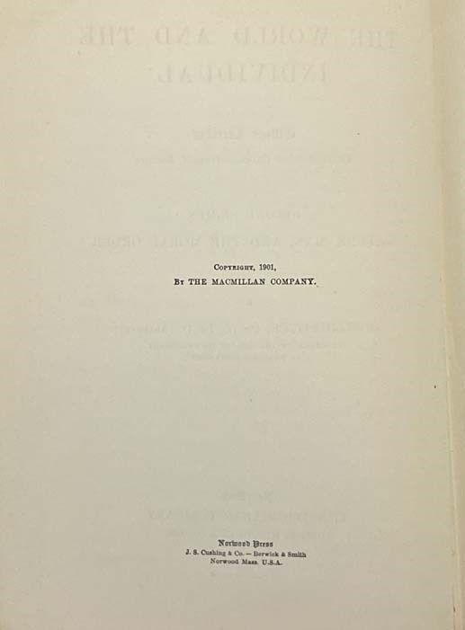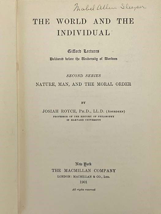 New York: The Macmillan Company, 1901. First Edition. Hard Cover. Very Good/No Jacket. 0x0x0. 2nd printing of volume 1, first edition, first printing of volume 2. Hinges just beginning to weaken, ink gift note on front endpaper of first volume, front free endpaper of second volume removed. 1901 Hard Cover. xvi, 588, [2]; xx, [2], 480 pp. 8vo. Brown cloth, gilt titles and triple rule, top edge gilt. Royce founded American idealism, and published many works on philosophy and history. In this work he conceptualizes the individual by saying 'to be is to be uniquely related to a whole,' but also that the idealization of our inner purposes enables us to connect them with the purposes of others in a larger whole of which we have no immediate experience: "the real world of our Idealism has to be viewed by us men as a temporal order [in which] purposes are fulfilled, or where finite internal meanings reach their final expression and attain unity with external meanings." Royce was a "versatile Idealist philosopher and teacher whose emphasis on individuality and will, rather than intellect, strongly influenced 20th-century philosophy in the United States... Considering himself an absolute Idealist and borrowing from the works of Hegel, Royce stressed the unity of human thought with the external world. His doctrines were centred on his view of absolute truth, and he declared that everyone must be in agreement with his assertion that such a truth exists, because even those skeptics who would deny this truth automatically affirm it. To deny absolute truth would be to affirm that some 'truthful' statements are possible, and thus the skeptic is caught in a self-contradictory attitude toward the possible existence of 'truth.' Royce's Idealism also extended to religion, the basis of which he conceived to be human loyalty. This 'religion of loyalty' was supplemented by an ethical system that showed his emphasis on the human will. In his words, the highest good would be achieved by 'the willing and practical and thoroughgoing devotion of a person to a cause.' Like the British Idealist F.H. Bradley, whose views resembled his own, Royce enhanced the reputation of European Idealists in his own country. Both men taught a monistic Idealism and helped raise the intellectual standards for philosophical treatment of human problems. Royce's contributions to psychology, social ethics, literary criticism, history, and metaphysics established him as a thinker of widely diverse talents." - Encyclopedia Britannica