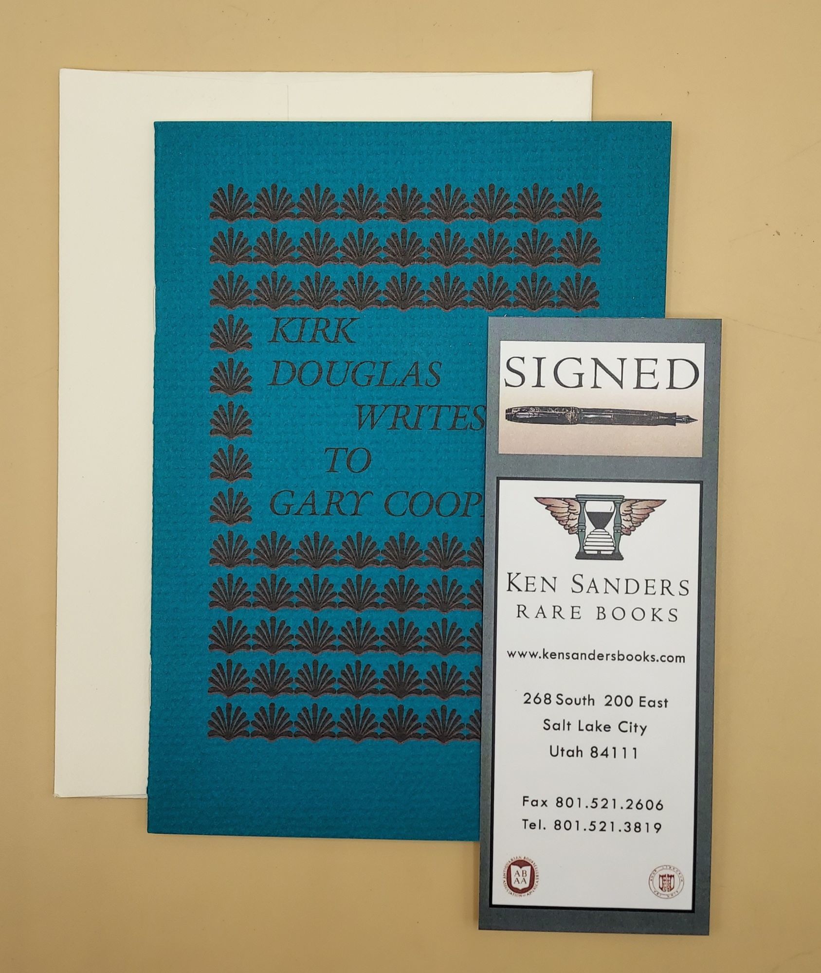 Santa Barbara, CA: Santa Teresa Press, 1992. First edition. Edition limited to 500 copies, of which this copy is part of the 30 copies which are autographed by Kirk Douglas and the publisher. Paperback. SIGNED. [7pp.] Duodecimo. Decorative blue stapled wrappers. Fine in original envelope. A short letter by Douglas to Cooper shortly before the latter's death. Douglas wrote the letter while filming the classic film 'Lonely are the Brave". The film was an adaptation of the Abbey work 'Brave Cowboy', and adapted by Dalton Trumbo.