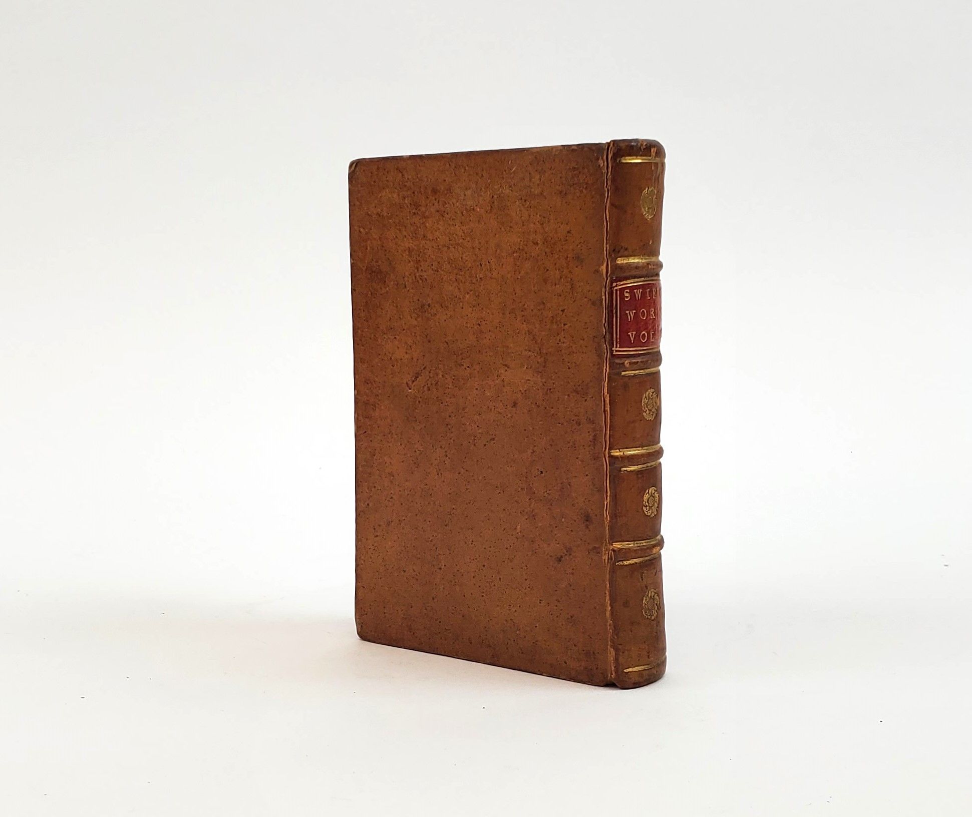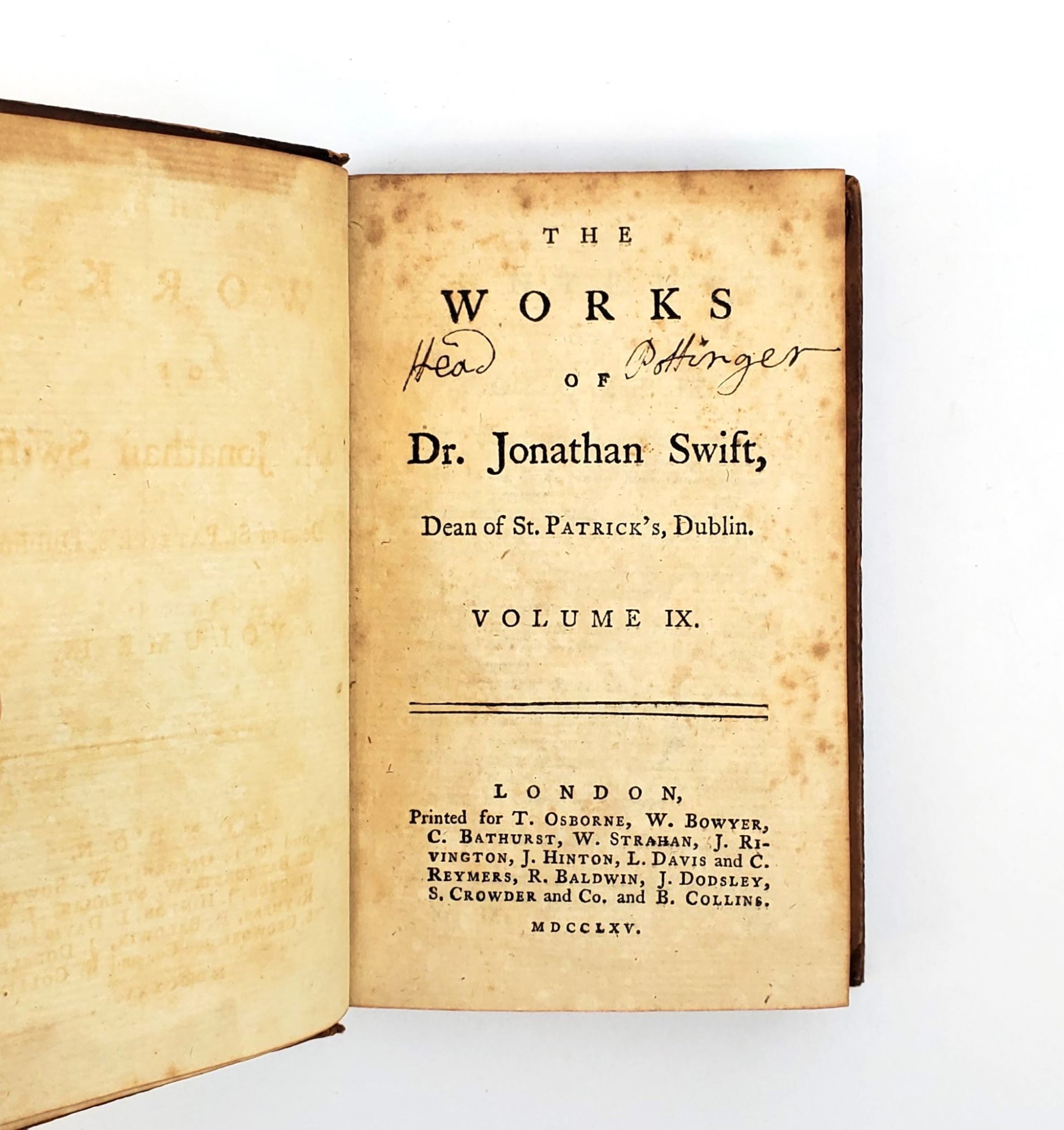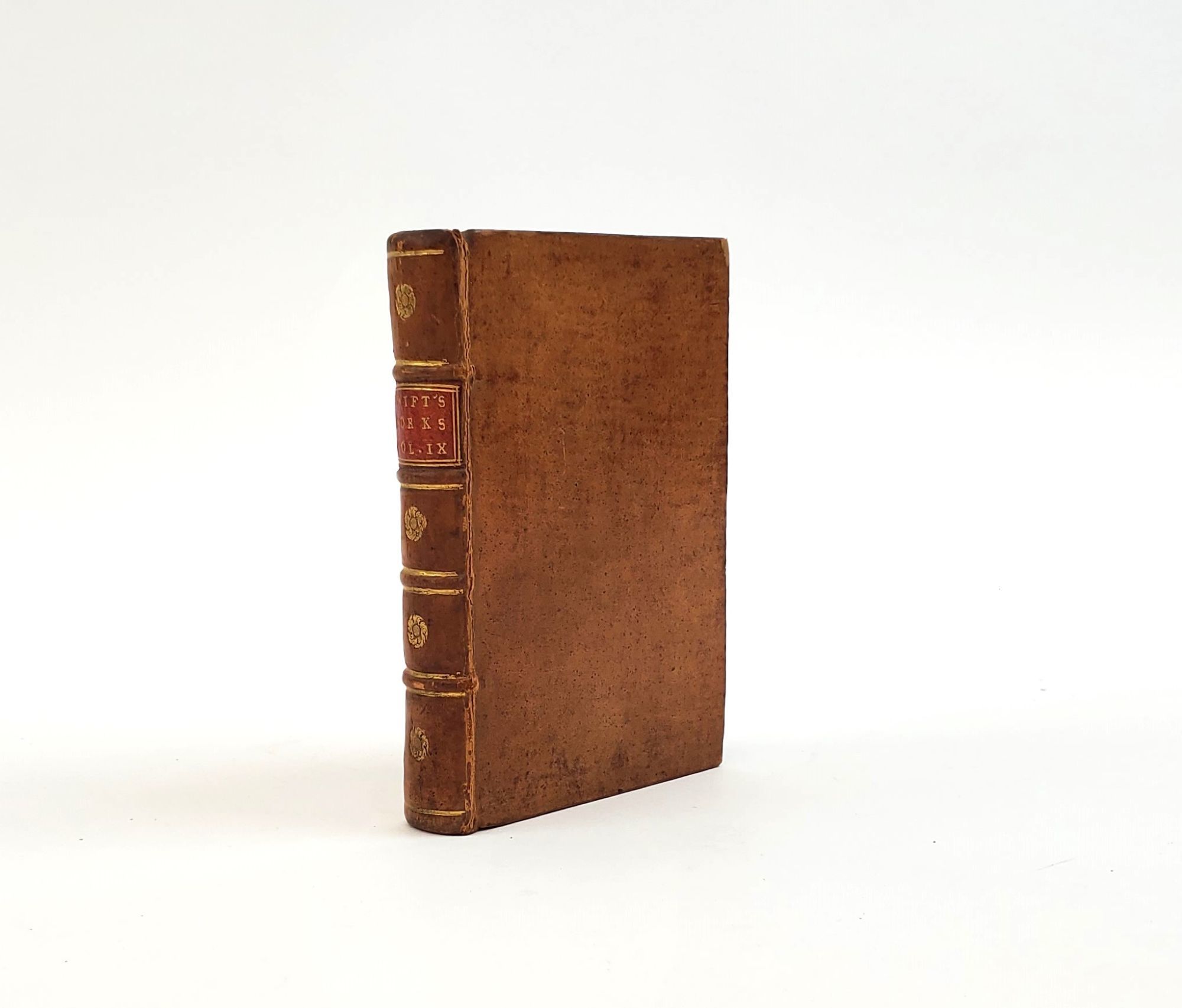 London: Printed for T. Osborne ... et al., 1765. Hardcover. 32mo; Vol. 9 only; G; Hardcover; Spine, brown with gold print on red banner, raised bands; Boards in brown leather, light wear to spine caps, hinges, and corners, light blemishes, else clean and strong; Text block has red speckled edges, bookplate on front pastedown, tanning to endpapers, cracked front hinge, name in ink on title page, light foxing throughout, else clean and tight; Includes "The Publick Spirit of the Whigs" and other essays, and "Tracts relating to Ireland"; ii, 361 pages. NOTE: Shelved in Locked Annex. 1366103. FP New Rockville Stock.