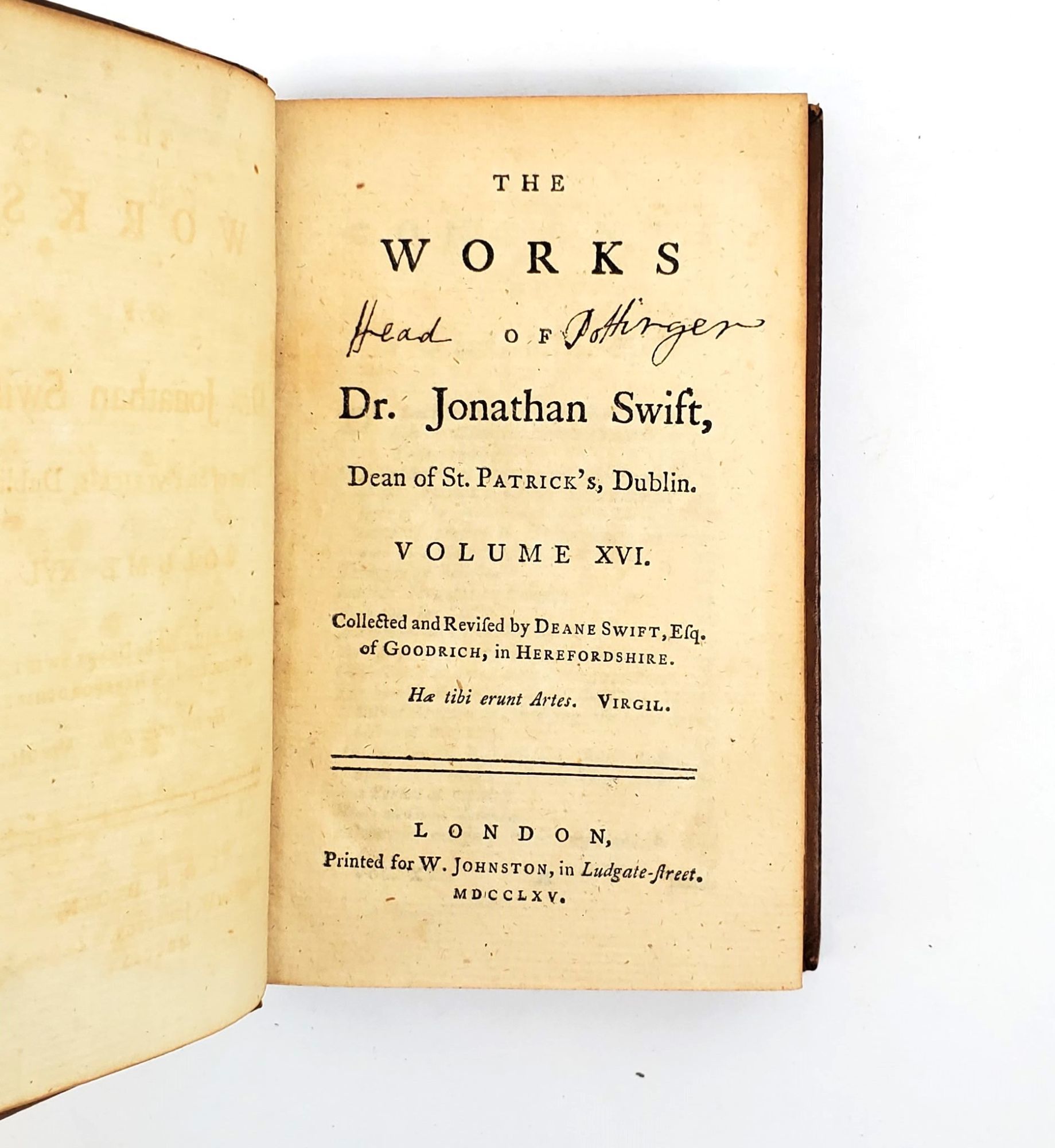 London: Printed for W. Johnston, 1765. Hardcover. 32mo; Vol. 16 only; G; Hardcover; Spine, brown with gold print on red banner, raised bands; Boards in brown leather, light wear to spine caps, hinges, and corners, light blemishes, else clean and strong; Text block has red speckled edges, bookplate on front pastedown, tanning to endpapers, name in ink on title page, light foxing throughout, else clean and tight; Includes "Dr. Swift's Answer to Several Letters Sent Him by Unknown Hands" and other essays, and "Letters to and from Several Persons"; vii, 315 pages. NOTE: Shelved in Locked Annex. 1366109. FP New Rockville Stock.