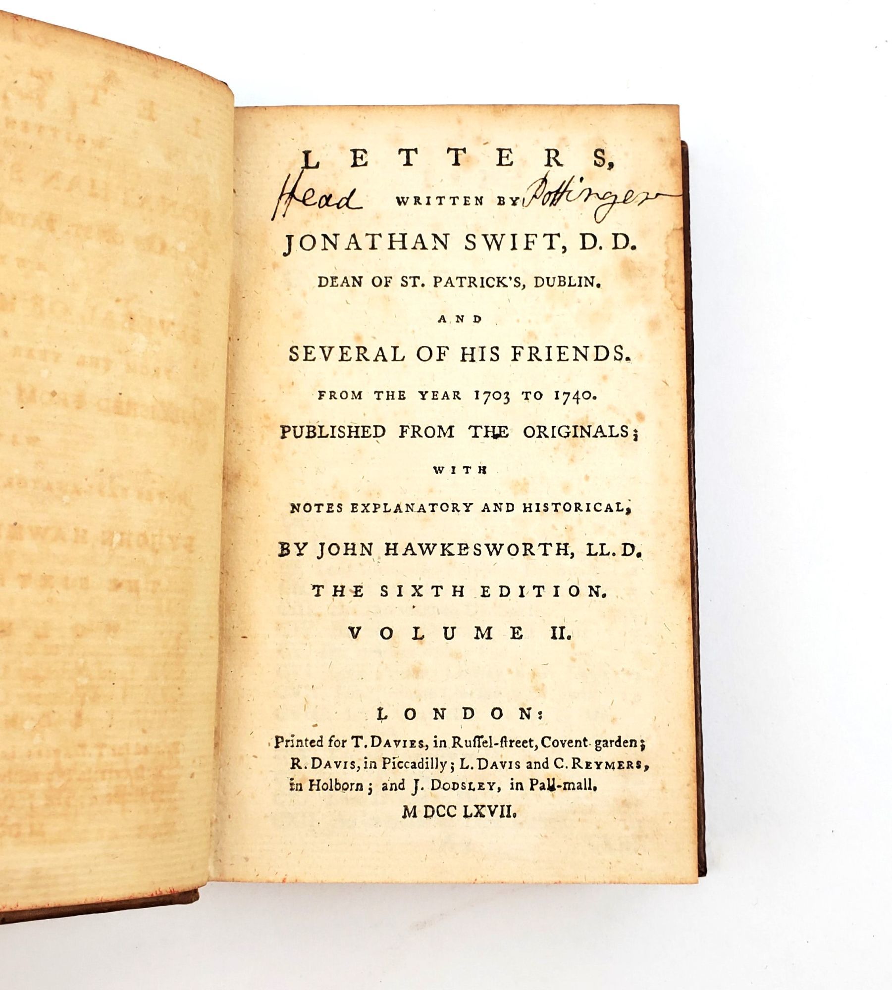 London: Printed for T. Davies ... et al., 1767. Sixth edition. Hardcover. 32mo; Vol. 2 of Letters only; Vol. 20 of set only; G; Hardcover; Spine, brown with gold print on red banner, raised bands; Boards in brown leather, light wear to spine caps, hinges, and corners, light blemishes, small surface tear on front, else clean and strong; Text block has red speckled edges, bookplate on front pastedown, tanning to endpapers, cracked front hinge, name in ink on title page, light foxing throughout, else clean and tight; xi, 344 pages. NOTE: Shelved in Locked Annex. 1366112. FP New Rockville Stock.