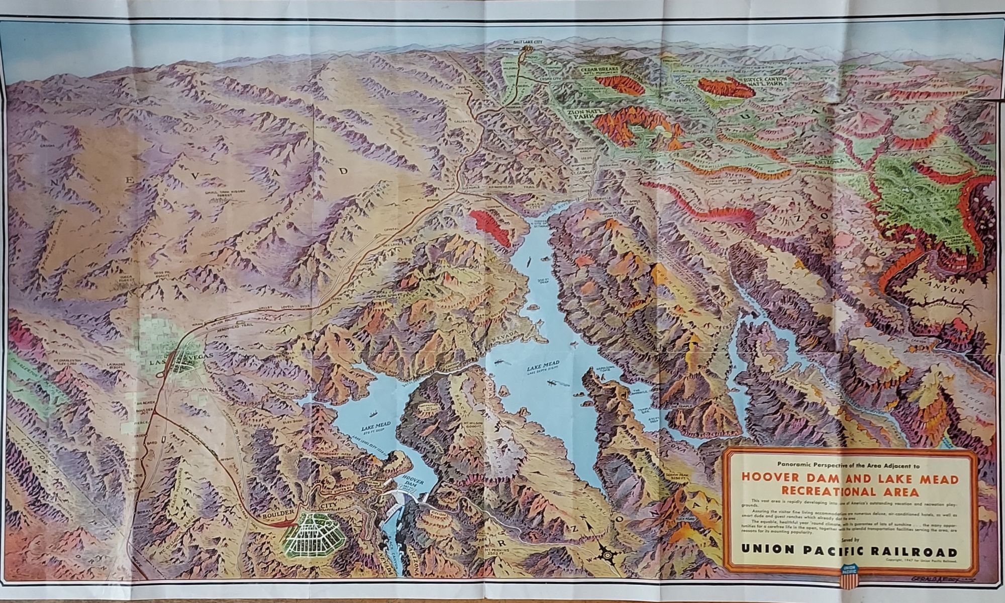 Panoramic Perspective of the Area Adjacent to Hoover Dam and Lake Mead Recreational Area. Served by the Union Pacific System (Las Vegas, Hoover Dam and Lake Mead Recreational Area)