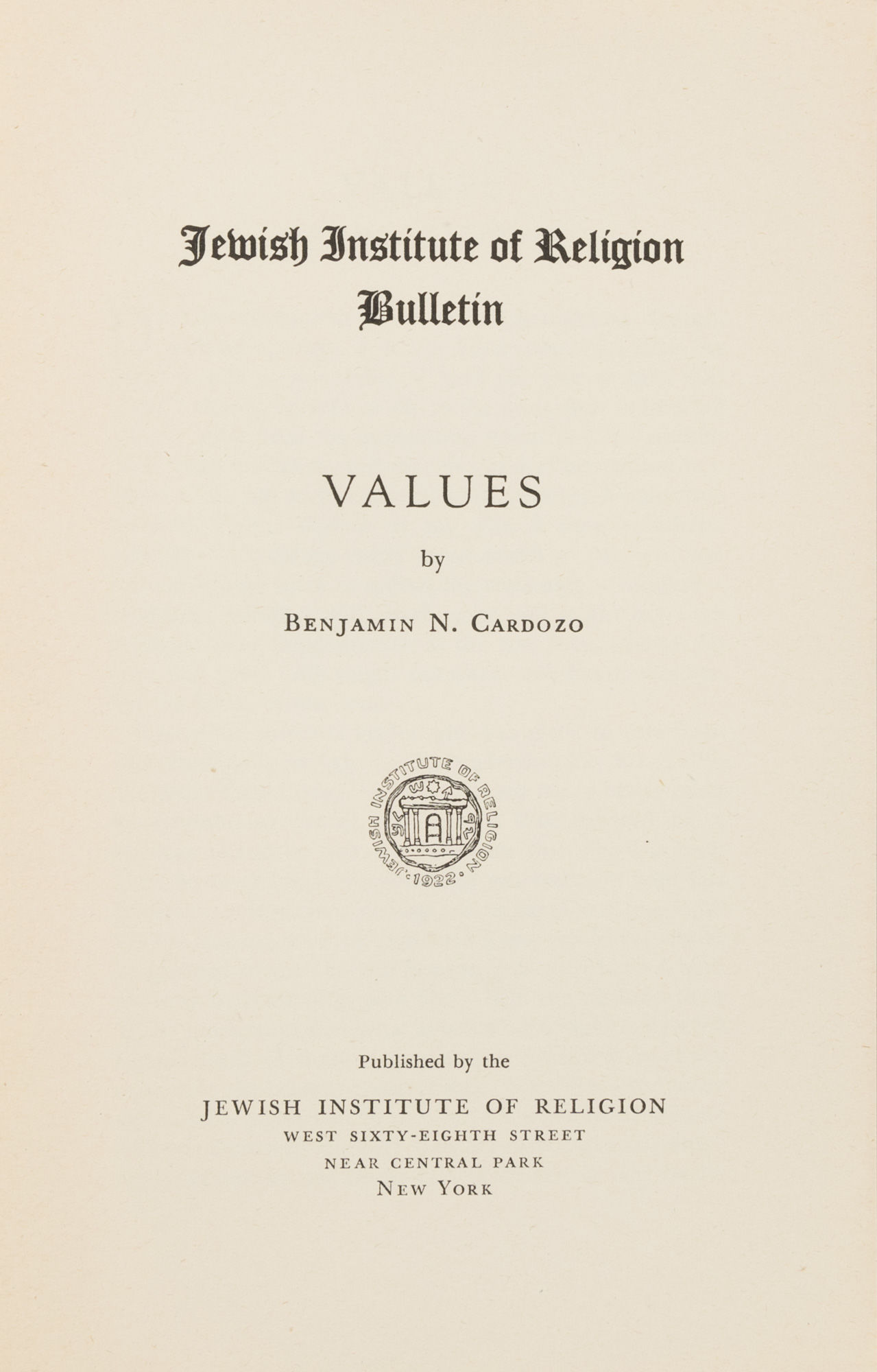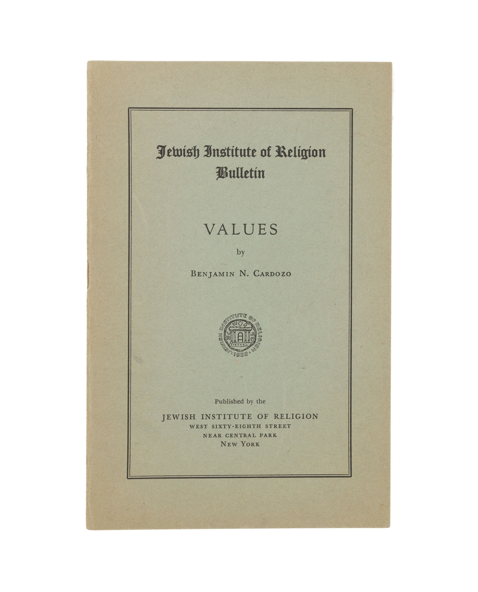 1944. Cardozo on Values Cardozo, Benjamin N. [1870-1938]. Values. New York: Jewish Institute of Religion, [1944]. 10 pp. Stapled pamphlet in stiff printed wrappers. Light fading to wrappers, internally clean. A well-preserved copy. $350. * Text of an address delivered at the Sixth Annual Commencement exercises of the Jewish Institute of Religion on May 24, 1931. At the time of the address, Cardozo was serving as chief judge of the New York Court of Appeals. OCLC locates 3 copies of this title in law libraries (Yale, U.S. Supreme Court, Ohio State University).