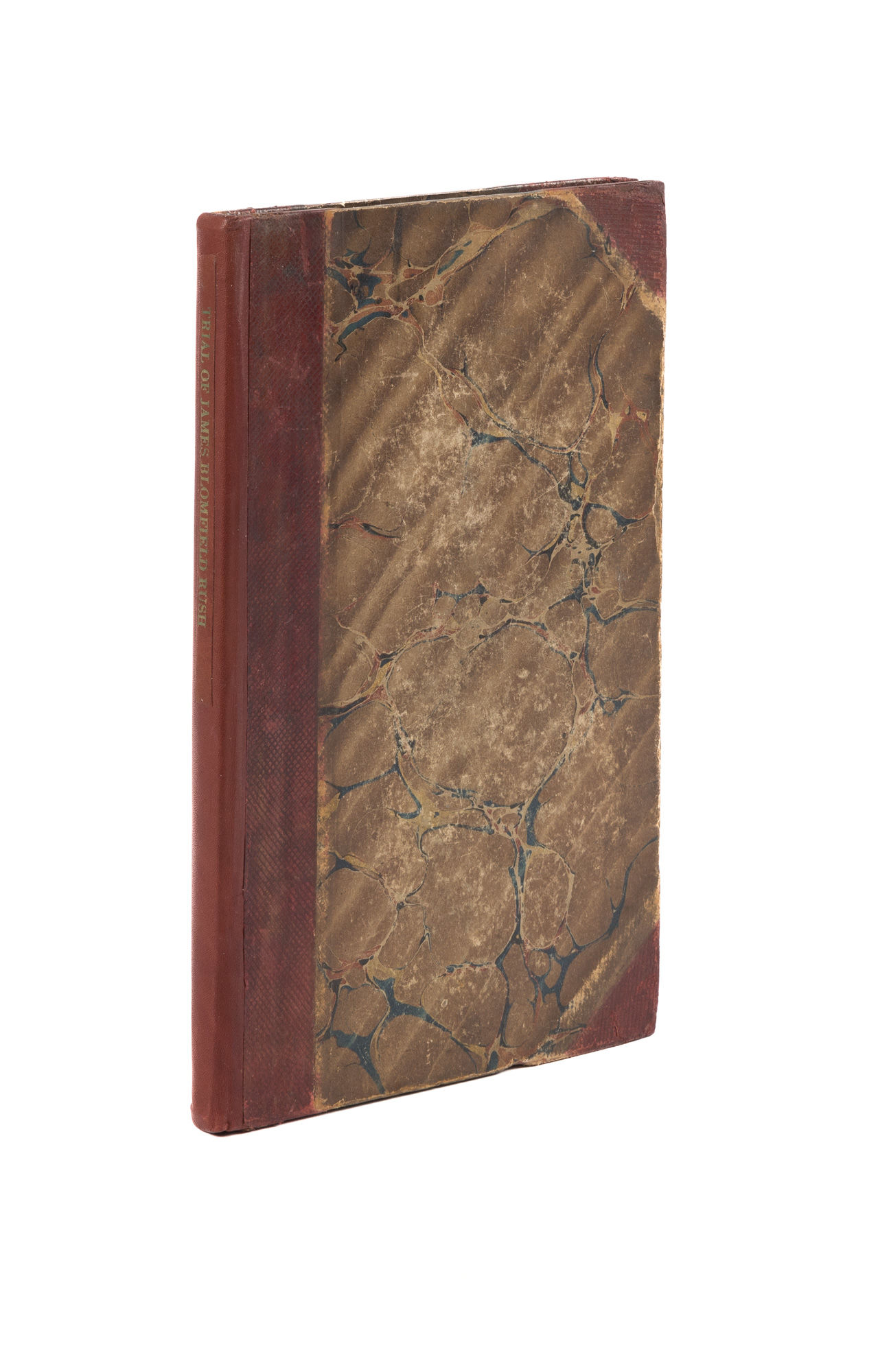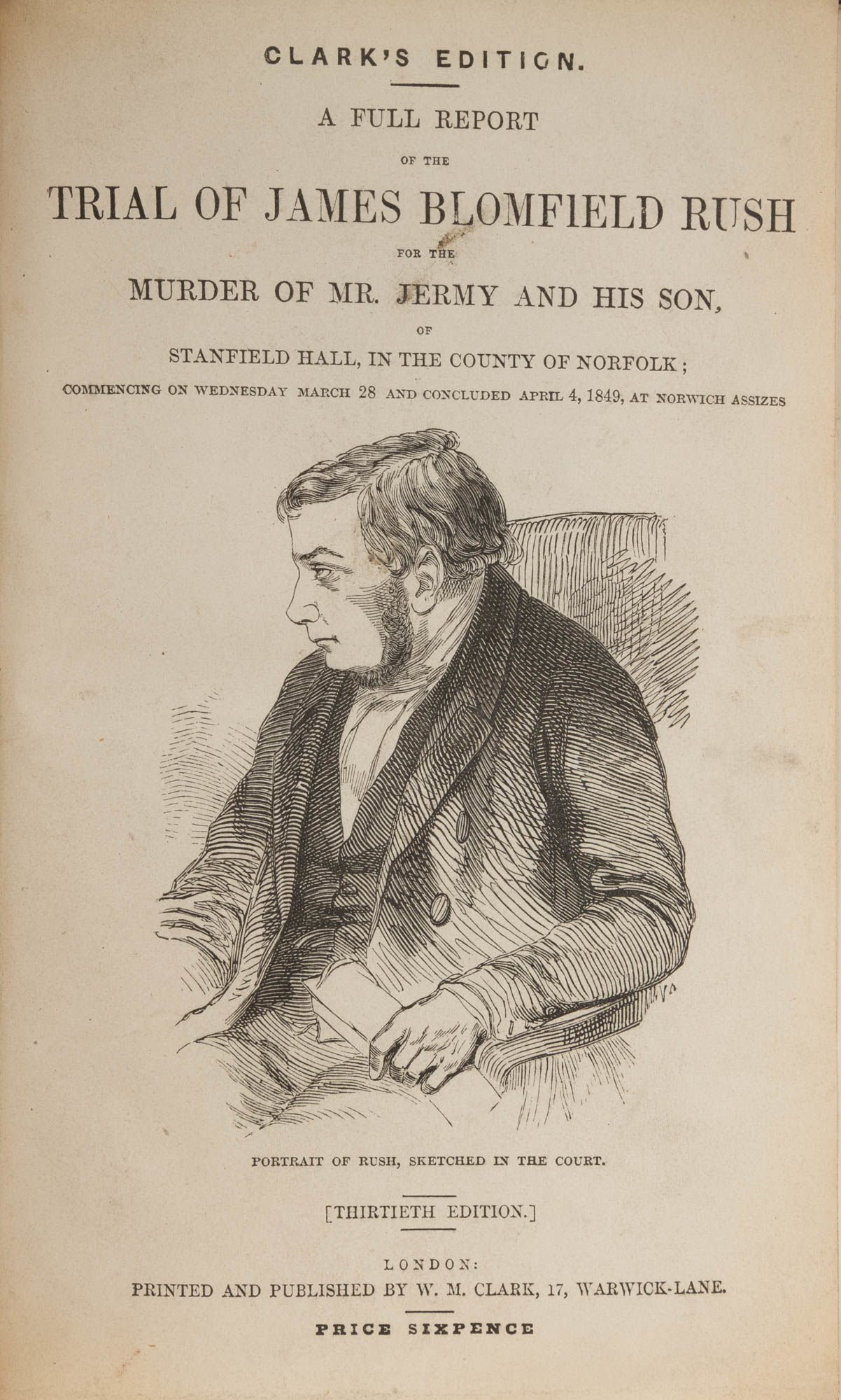 1849. London: W.M. Clark, [1849].. London: W.M. Clark, [1849]. The Murders at Stanfield Hall [Trial]. Rush, James Blomfield [d.1849], Defendant. A Full Report of the Trial of James Blomfield Rush for the Murder of Mr. Jermy and his Son, Of Stanfield Hall, In the County of Norfolk; Commencing on Wednesday, March 28, And Concluded April 4, 1849, At Norwich Assizes. London: Printed and Published by W.M. Clark, [1849]. [8], 102 pp. Woodcut title page vignette and 4 unnumbered leaves of woodcut portraits and illustrations. Octavo (8-1/4" x 5"). Contemporary three-quarter sheep over marbled boards, rebacked with lettering piece to spine, hinges mended. Light rubbing to boards, moderate rubbing to board edges, corners bumped and lightly worn. Moderate toning to interior, light soiling in a few places, a few (mostly partial) cracks in text block, all leaves secure, trimming affecting last line of text on p. 91 without loss to legibility. $125. * Thirtieth (stated) edition, one of several from the same year. Rush, a delinquent tenant of Isaac Jermy and his son, devised a plan to kill the two men, their servant, and the son's wife and blame the murders on rival claimants to the Jermy estate. He succeeded in killing the Jermys but failed to kill Mrs. Jermy and the servant, who survived to identify him. Popularly known as the "murders at Stanfield Hall," the killings became a national sensation, with a wax figure of Rush displayed prominently at Madame Tussauds.
