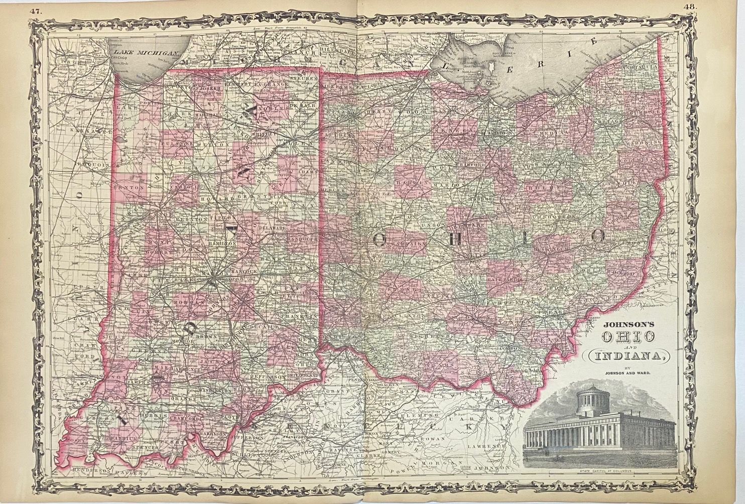 Beautifully detailed double page map of Ohio and Indiana divided into counties and townships. Shows towns, major routes, waterways and railroads. Includes image of the state capitol building in Columbus. In excellent condition.