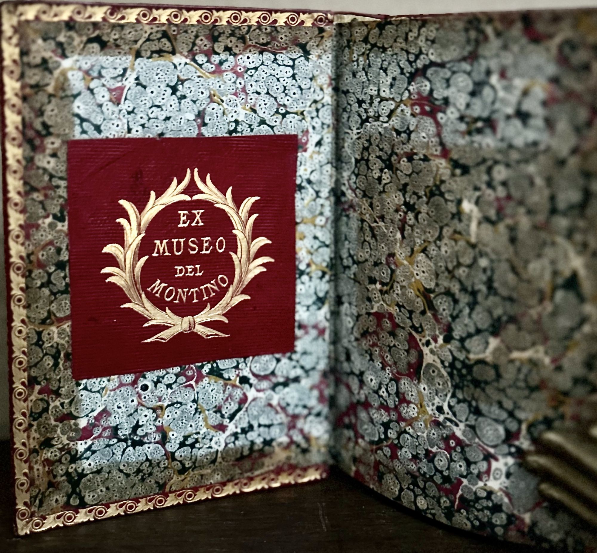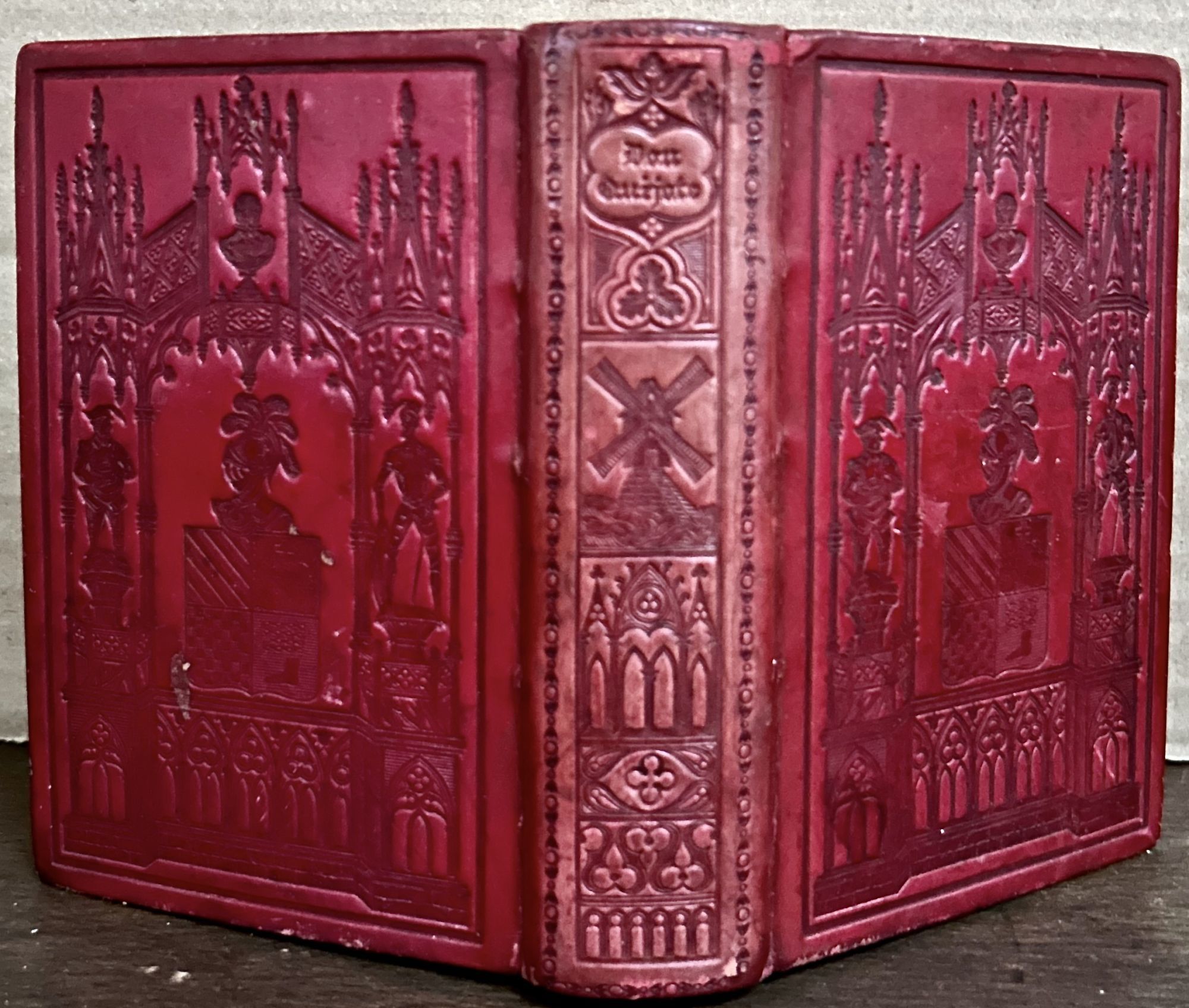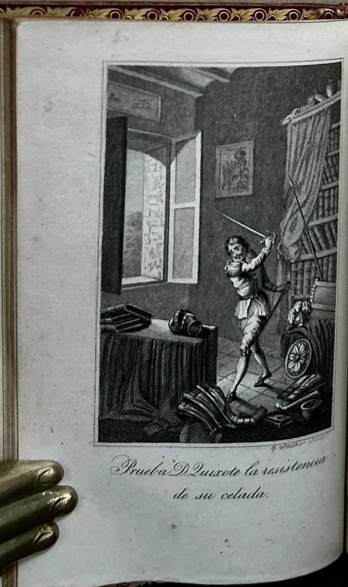 Paris: Didot-Mayor, 1827. leather_bound. Full Cathedral blind stamped full calf, with central coat of arms and windmill device, spine slightly sunned. Aeg. Near fine. 615 pages. 12 x 8 cm. Half title, engraved title page, engraved portrait frontispiece, and numerous steel engraved plates with a double-paged engraved map after the text at rear. This rare miniature edition prompted by the publisher's desire to associate his name with that of Cervantes invented a new size in type that overcame the difficulty of miniaturization allowing the printing in one column instead of two. Book provenance of Domingo del Monte (1804-1853), Cuban literary critic and poet. Domingo del Monte y Aponte was the most important literary critic in nineteenth-century Cuba. A humanist and respectable poet in his own right, Del Monte was the initiator of Cuba's national literature. With his red leather gilt lettered bookplate, "Ex Museo Del Montino." Inscriptions of Domingo Guillermo de Arozarena (dated 23 October 1962 to from Ramon Zambrana) and to "Dr. Baldwin" dated 1909 from Bora Adel Morley. BRUNET Vol.1 pt.2. p.1750. PALAU 52051. RUIS 79. Bound by Simier R. Durol: inner dentelles, marbled endpapers. Plates by British engraver Ebenezer Stalker (1781-1847).