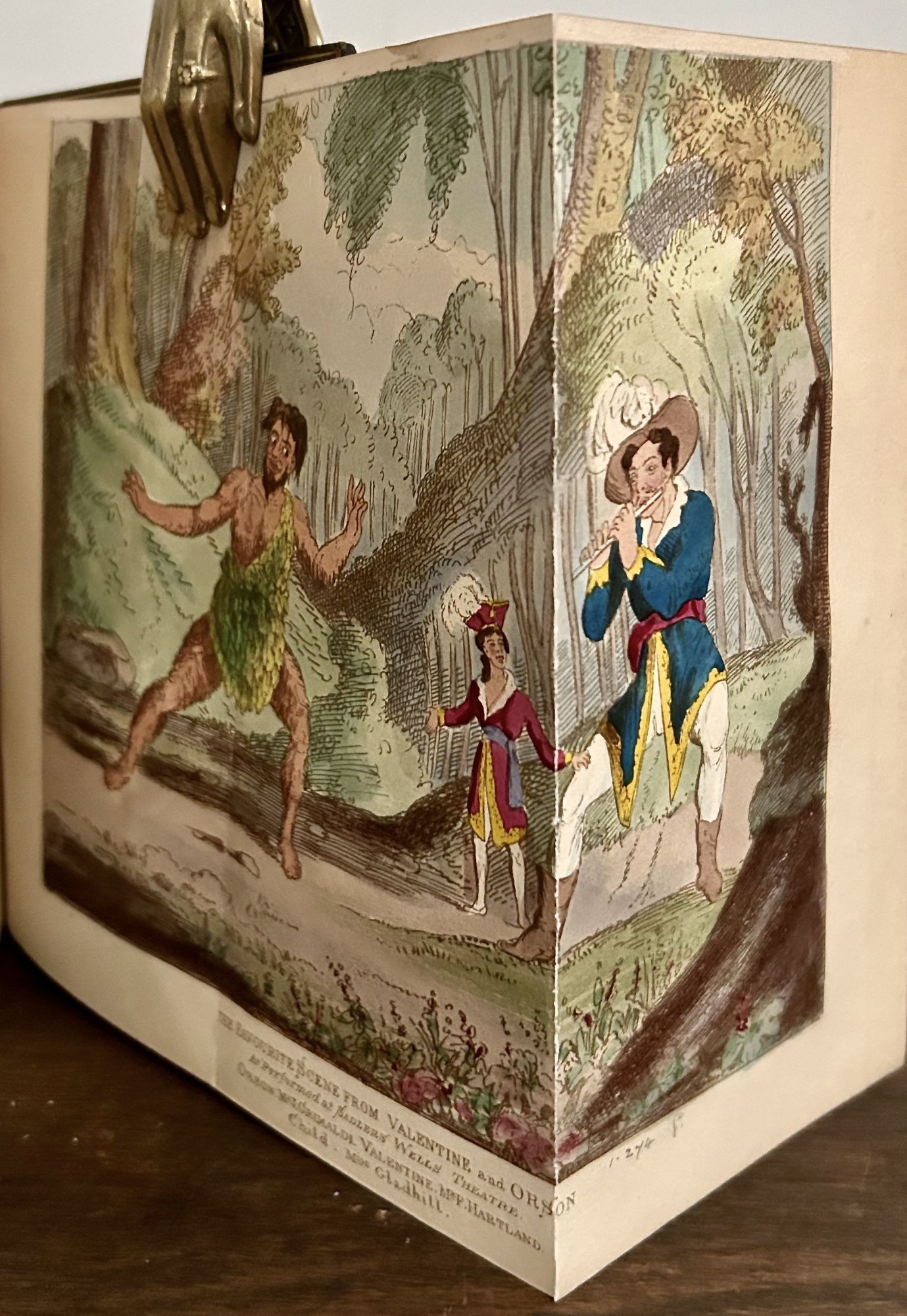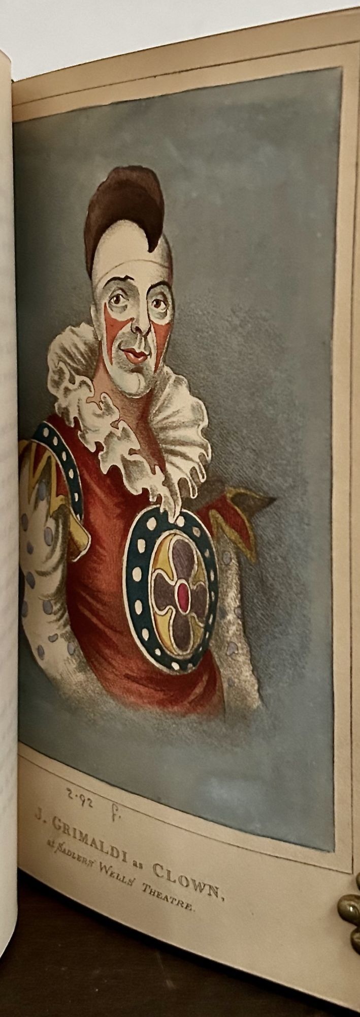 London: Richard Bentley, 1838. First edition, second issue. leather_bound. Full green levant with large central pictorial inlays of Grimaldi as a clown and as another theatrical character in various color morocco's within a geometric gilt frame. Aeg. Two vols. Cruikshank, George. 288, 263 pages. 19 x 12.5 cm. Half–titles, EXTRA–ILLUSTRATED WITH 61 ENGRAVINGS including the 12 etchings by George Cruikshank, many hand–colored and folding (including a play bill from the Drury Lane Theater announcing his last public appearance, Friday, June 27. 1828), several proofs before letters. Grimaldi was considered the most celebrated of English clowns, know particularly for his pantomime. An early work of Dickens, who wrote the preface, the last chapter, and edited this work on the famous English actor and clown according to Johnson's biography. Gilt stamped, bound by Baytun; issue with the plate "Last Song" without a border. Spine in six compartments, raised bands gilt lettered, inner dentelles, original brown cloth bound in at end, marbled endpapers with spine lettered at foot noting "Extra Illustrated." ECKLES p.152-153. GIMBEL B64.