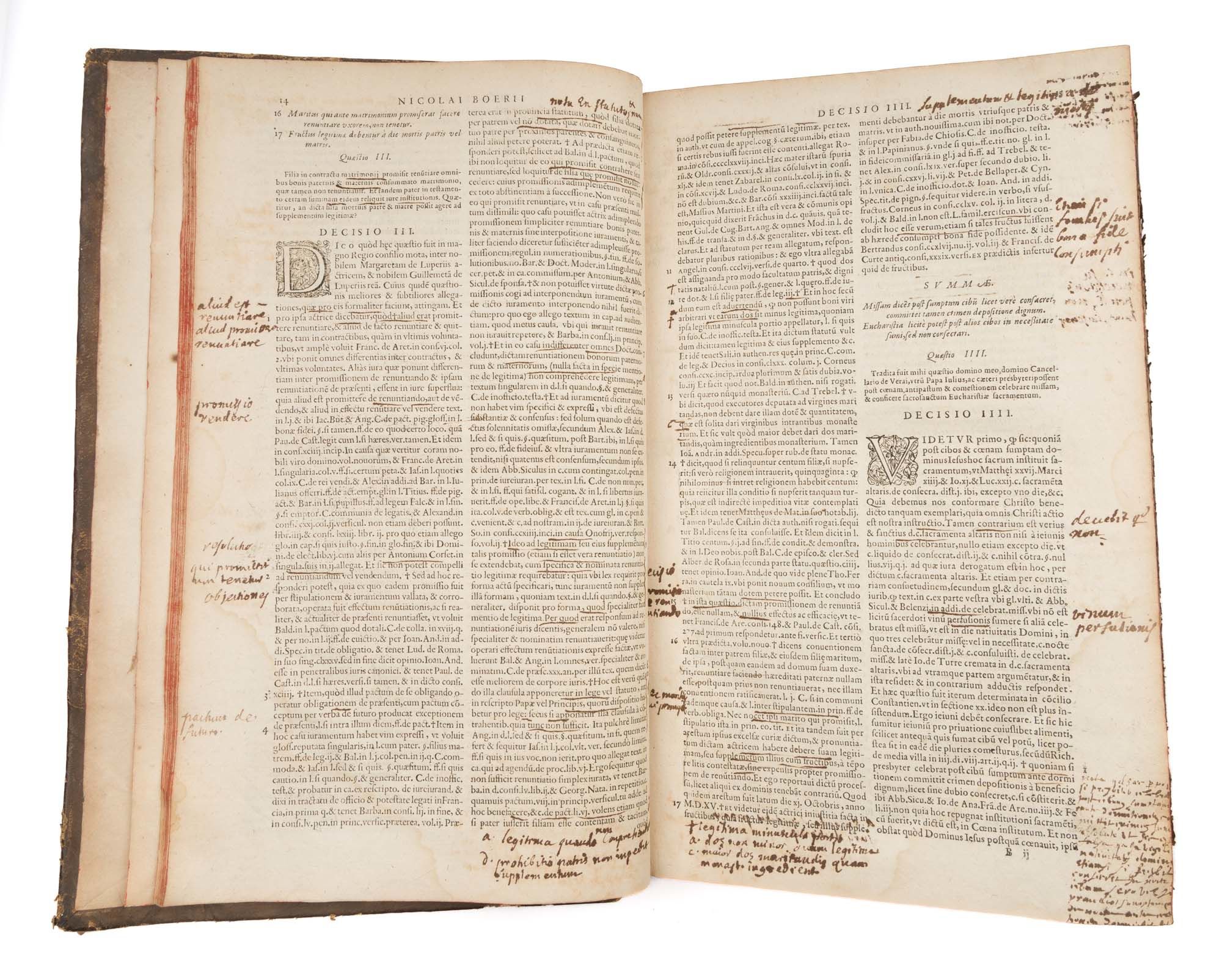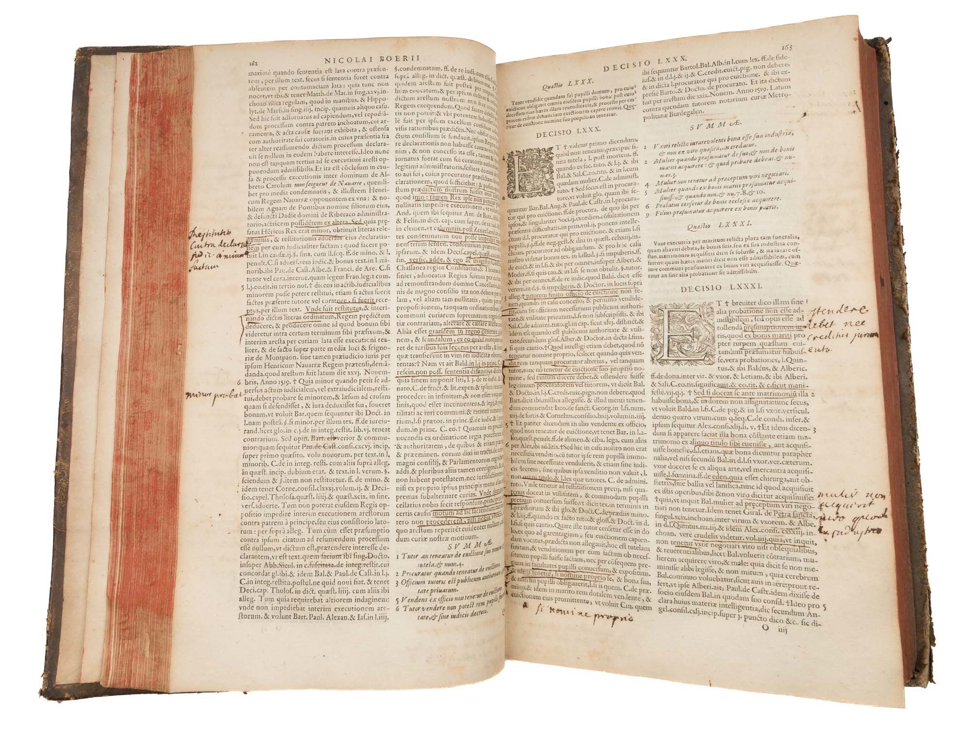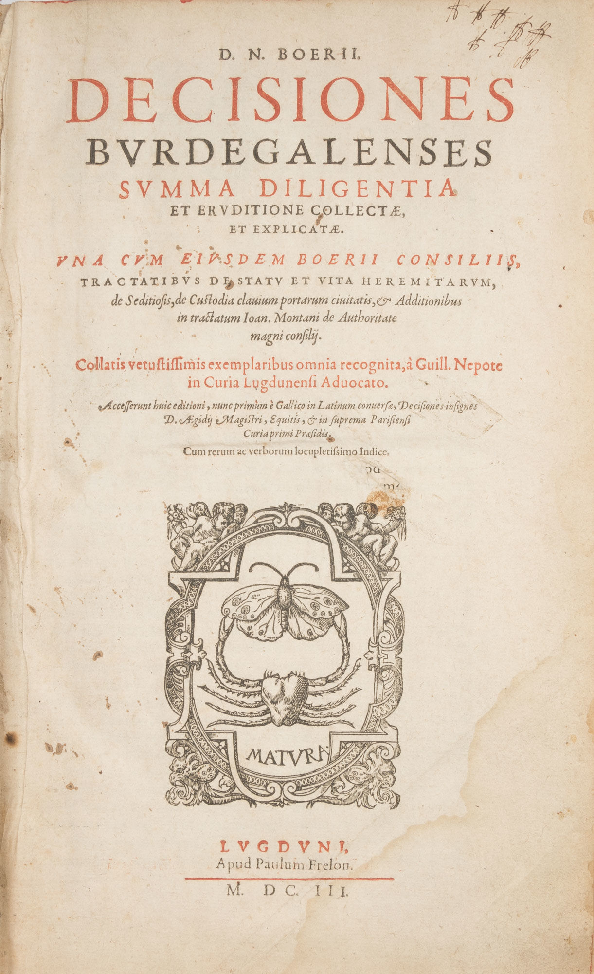 1603. A Well-Regarded Collection of Decisions from the Parlement of Bordeaux Bohier, Nicolas de [1469-1539]. Decisiones Burdegalenses Summa Diligentia et Eruditione Collectae, Et Explicatae. Una Cum Eiusdem Boerii Consilius, Tractatibus de Statu et Vita Heremitarum, De Seditiosis, De Custodia Clavium Portarum Civitatis, & Additionibus in Tractatum Ioan. Montani de Authoritate Magni Consilii. Collatis Vetustissimis Exemplaribus Omnia Recognita, A Guill. Nepote in Curia Lugdunensi Advocato. Accesserunt Huic Editioni, Nunc Primum e Gallico in Latinum Conversae, Decisiones Insignes D. Aegidii Magistri, Equitis, & In Suprema Parisiensi Curia Primi Praesidis. Cum Rerum ac Verborum Locupletissimo Indice. Lyon: Apud Paulum Frelon, 1603. [xii], 1020, [45] pp. Folio (13" x 8"). Contemporary speckled calf, gilt spine with raised bands and lettering piece, edges rouged. Light rubbing, a few small dampstains and some shallow scuffing and scratches to boards, moderate rubbing to extremities, front joint starting at ends, rear joint starting at head, light wear to board edges and corners, which are bumped, hinges cracked. Light toning to interior, occasional very light foxing, faint dampstaining to first and last fifty or so leaves, minor worming to fore-edge of pp. 141-162, early underlining, marginal marks and annotations through p. 244 (and to a few other later pages), light soiling, small hole and early (illegible) ink annotation to title page. $650. * Later edition. Bohier, Viscount of Pommiers, was a lawyer and principal magistrate of the Parlement of Bordeaux. First published in 1547, his collection of decisions from that body was well-regarded and highly useful, particularly for issues of canon and criminal law, and was reprinted well into the seventeenth century. The annotations to our copy appear to consist of both brief glosses and interpretative notes. OCLC locates 7 copies of this edition, none in North America. Universal Short-Title Catalogue 6900334.