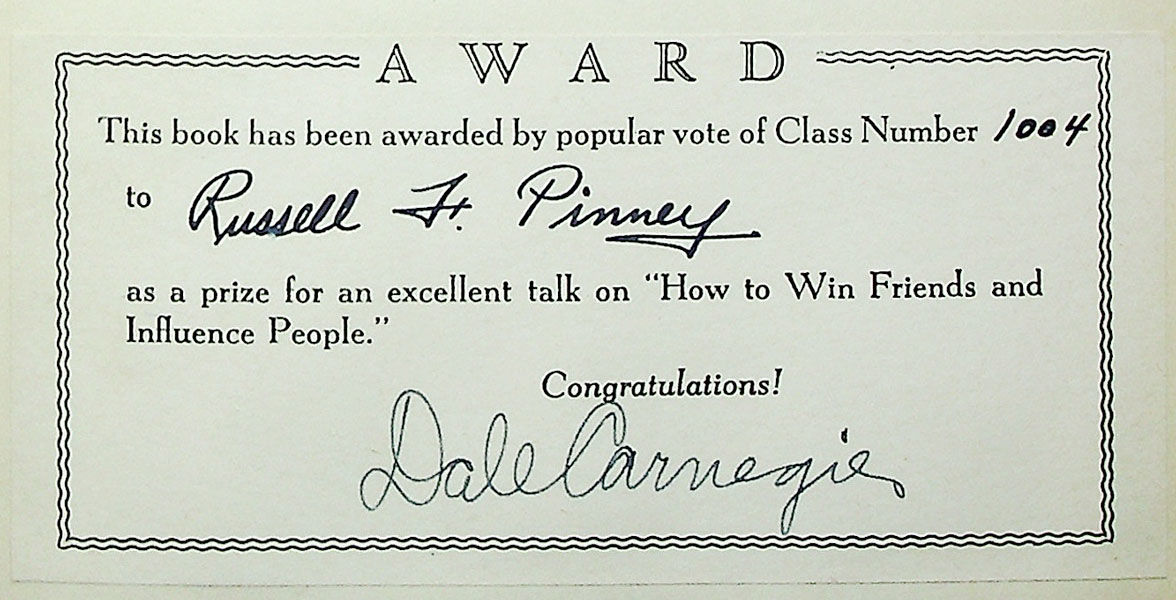 Forest Hills, NY: Forest Hills Publishing Co, 1932. Octavo (21cm); glossy pictorial boards; brown topstain; x,305,[3]pp. With an Award label signed by Carnegie mounted to the front endpaper. Gentle sunning to spine, light wear to extremities, with a few tiny tears and indentations to spine ends; contents clean; Near Fine, without dustjacket, as issued. Attractive copy of this early work by Carnegie, preceding his best-selling How to Win Friends and Influence People by four years. A biographical work on the life of Abraham Lincoln, detailing his early years, the difficulties he faced in the White House, his marriage, and leading the nation during the Civil War. First published by The Century Company in 1932, the title was reprinted numerous times over several decades, frequently given out as a prize in the Dale Carnegie Course.