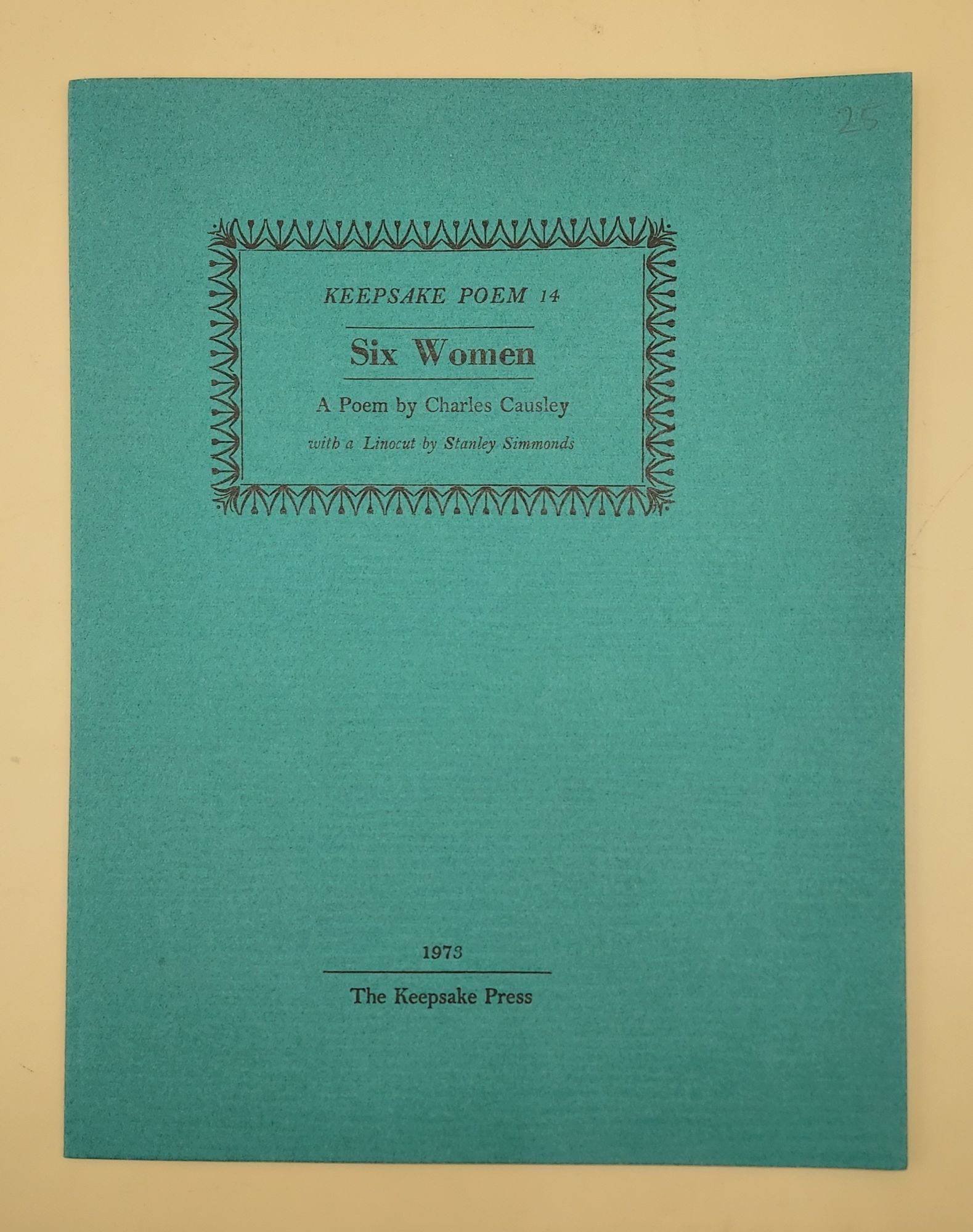 Richmond, Surrey, United Kingdom: The Keepsake Press, 1973. Limited edition. Very Good +. A single poem and linocut housed in green printed wrappers [23 cm]. Front wrapper lightly creased. In the envelope, soiled with several partial footprints. With a Linocut by Stanley Simmonds. One in an edition of 180 copies.