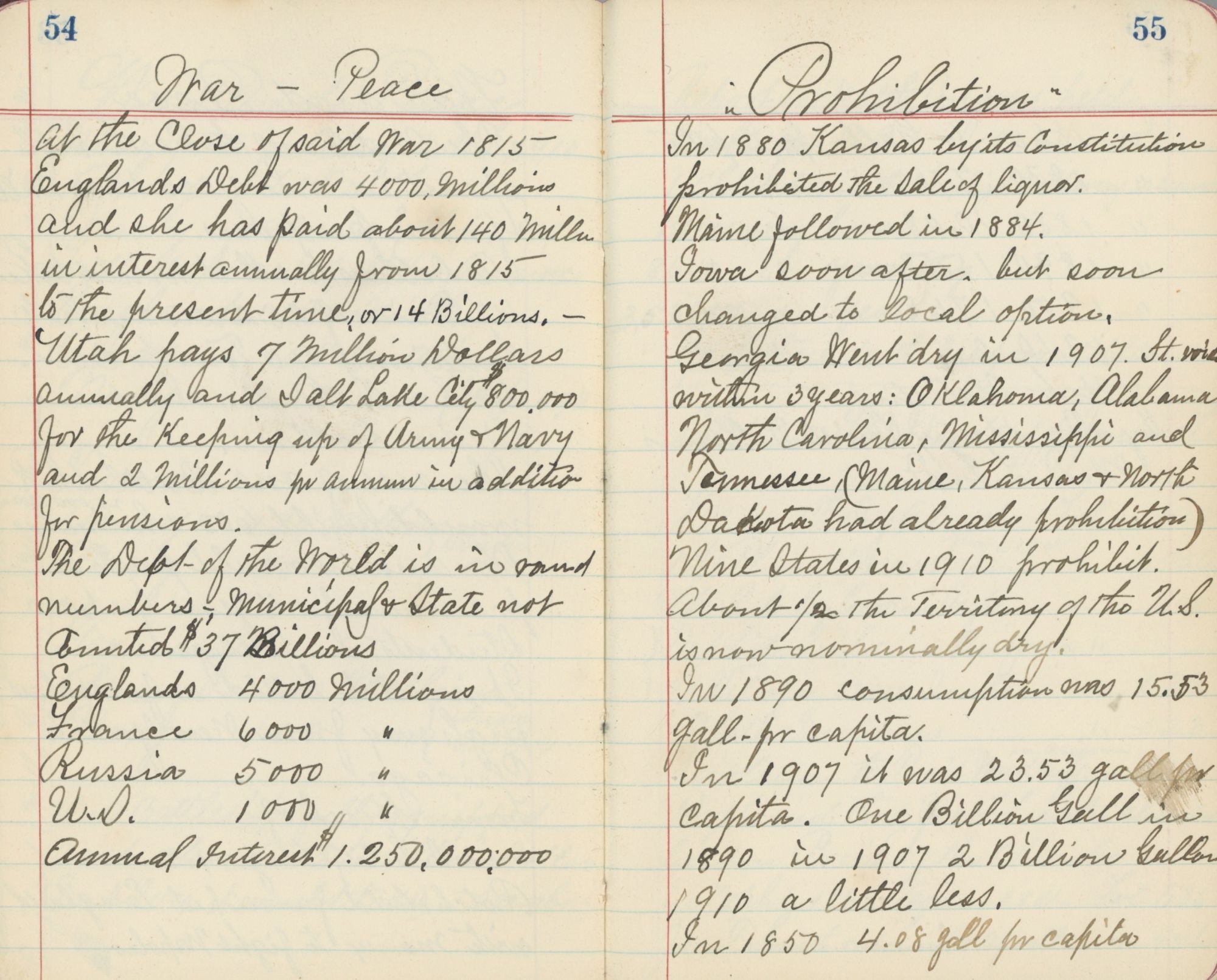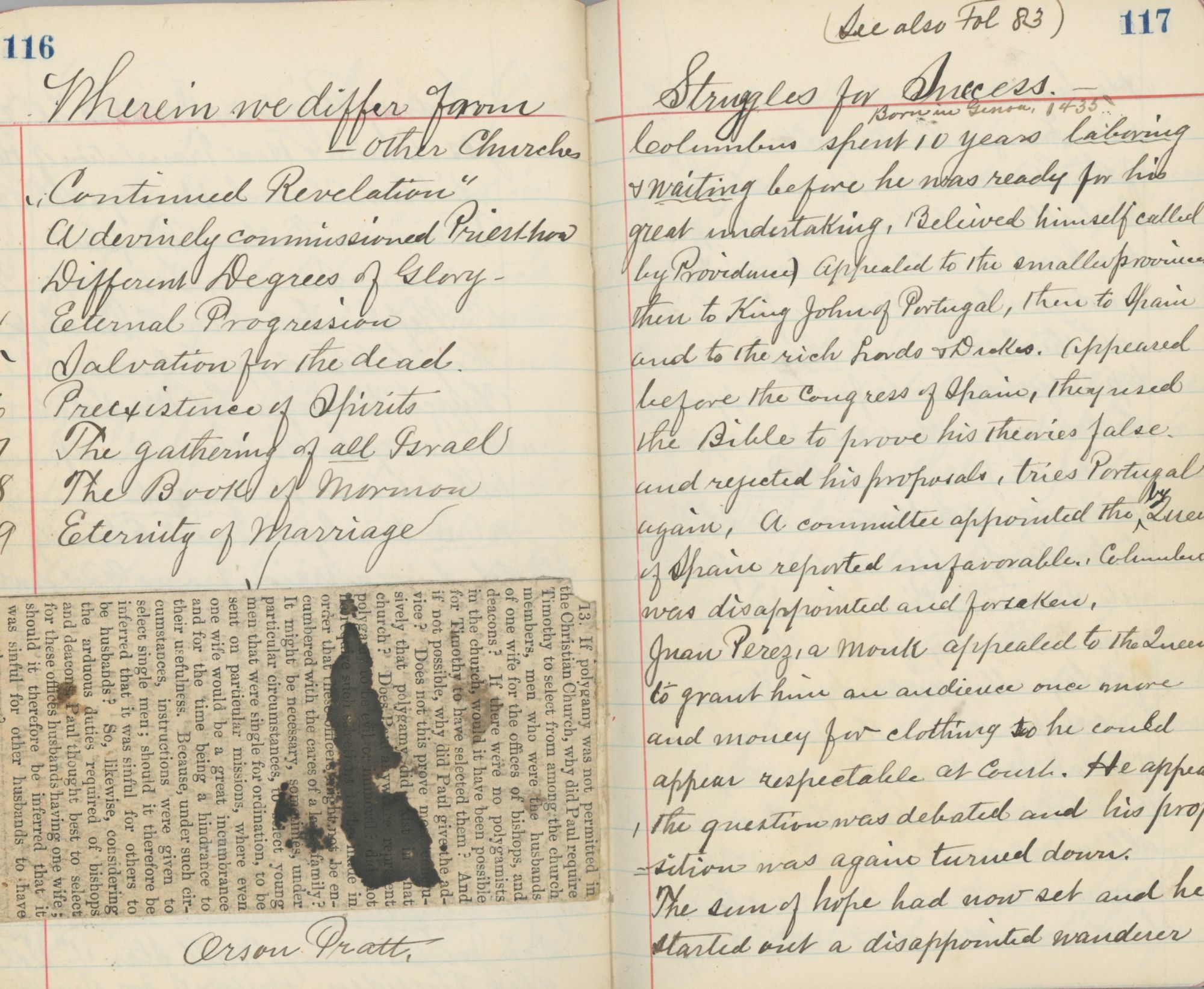 Offered here is a journal Lund kept as an alphabetical index to religious ideas, with additional ruminations and philosophical musings included, intended possibly as a keepsake for a family member as it was passed on to one of his grandsons following his death, per an inscription inside. The entries track themes such as “Astronomy” and “The Jews” through the Old and New Testaments and Book of Mormon, and are intended to weave the sources together into a single resource on religious themes. The facts that Lund highlights range are interesting and as a group the entries would be of interest to scholars of Mormon thought during the period. It is also interesting which other subjects Lund chooses to write about, such as transcribing verbatim an article written about the transatlantic cable in 1921 just months before his death. In another section he lists per capita consumption of “Intoxicating Liquors,” comparing it to other vices such as tobacco, jewelry, patent medicine and chewing bum. One page ranks the ways in which the Church of Latter Day Saints differs from other churches. Some of the lists refer to LDs-related subjects using the prefix “FOL,” which raises the possibility that the volume served as his own reference for works held at the LDS archive that he had researched.