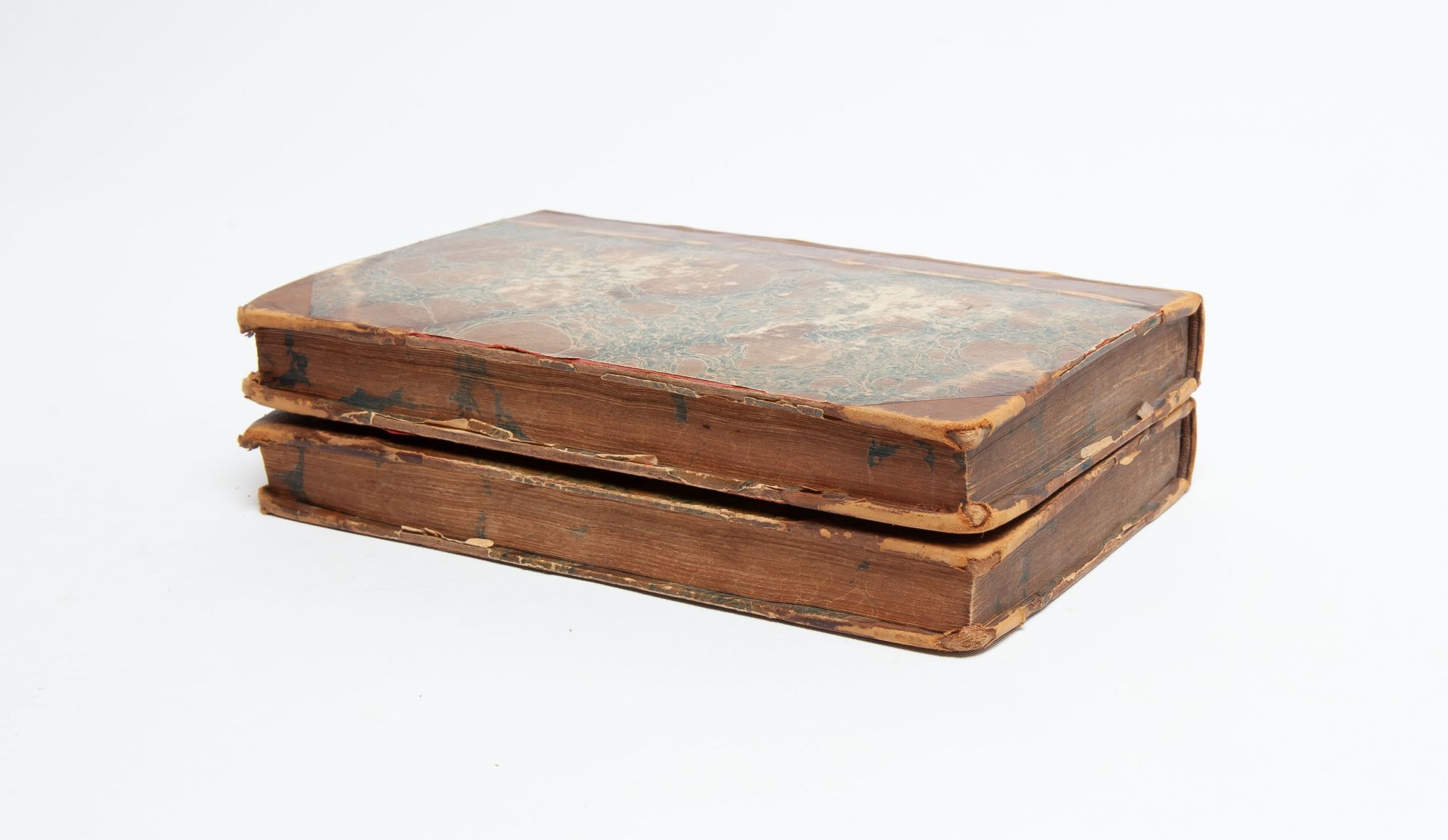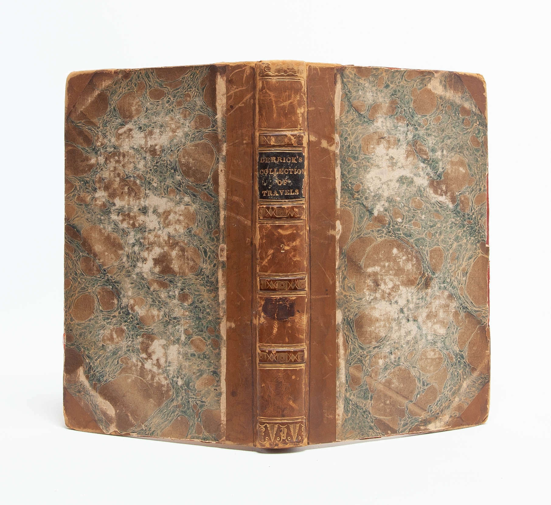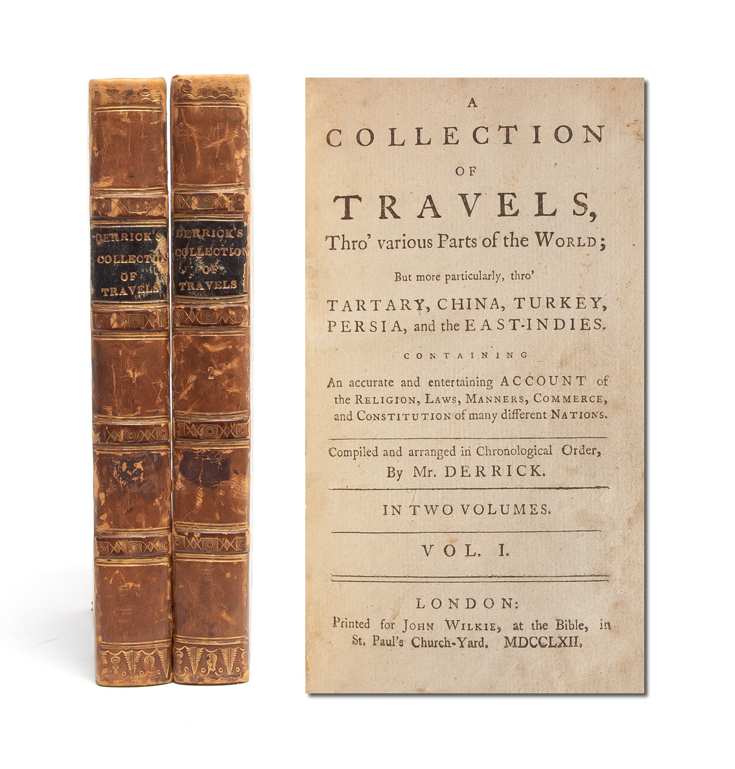 London: John Wilkie, 1762. First edition. With title page of volume II erroneously dated MDCCXII as called for by ESTC. Contemporary half calf over marbled boards, measuring 168 x 100mm and collating complete: [20], 338; [12], 324. A square copy with joints professionally renewed; some chipping to spine labels and gentle shelfwear to boards. Faint dampstaining to lower corner of contents in volume I and paper loss to upper corner of pages 203-204 affecting 9 lines each. Volume II overall clean, with long archivally reinforced tear to pages 131-132 and paper loss to lower corner of pages 171-172 with no text loss in either case. An exceptionally scarce fantastical travel narrative with erotic content, published by notorious Grub Street writer and demi-monde ally Samuel Derrick. ESTC locates only three copies at institutions (BL, Columbia, and UCLA) and of the three copies to appear in the modern auction record, the most recent was in 1941. The present is the only example on the market.