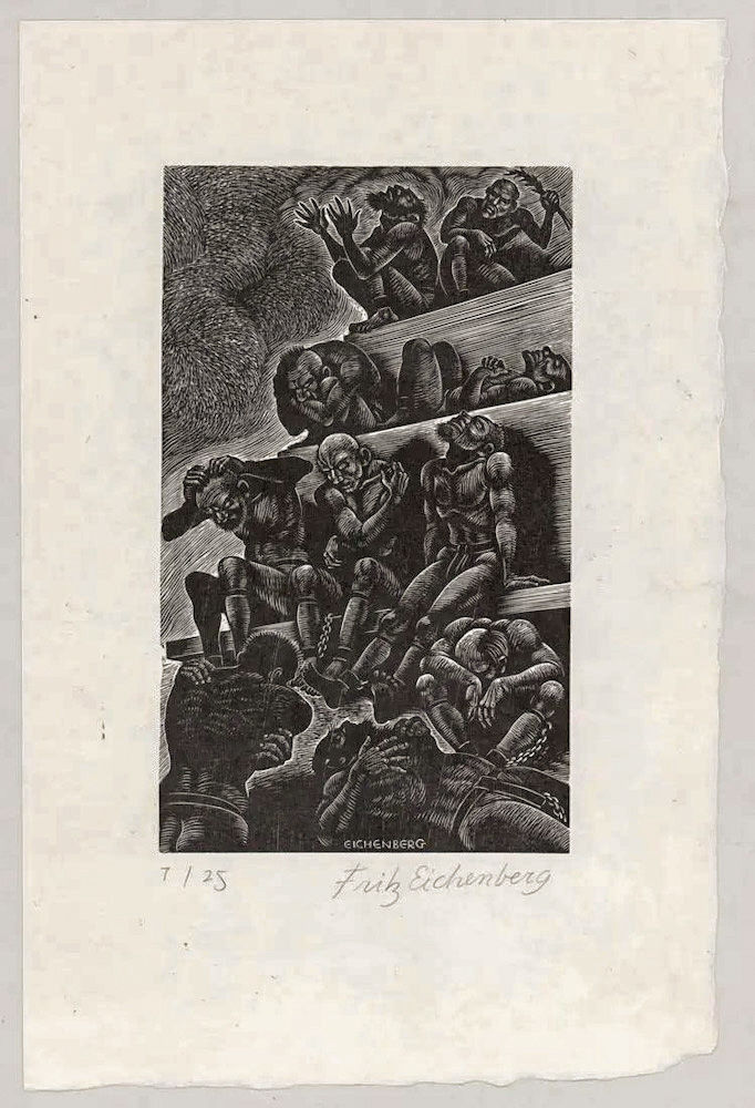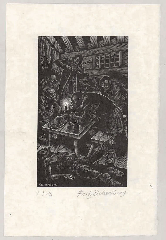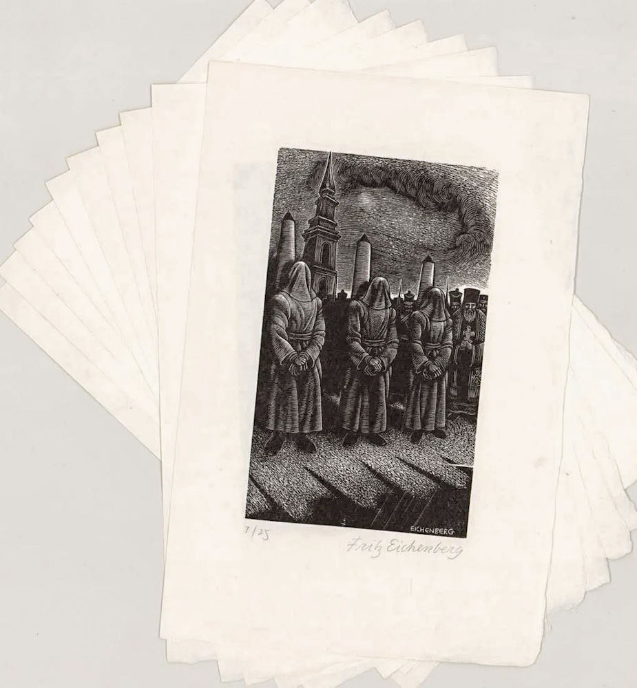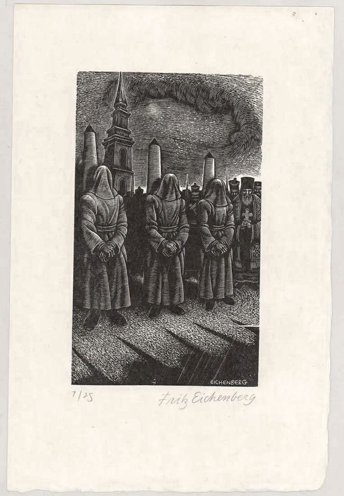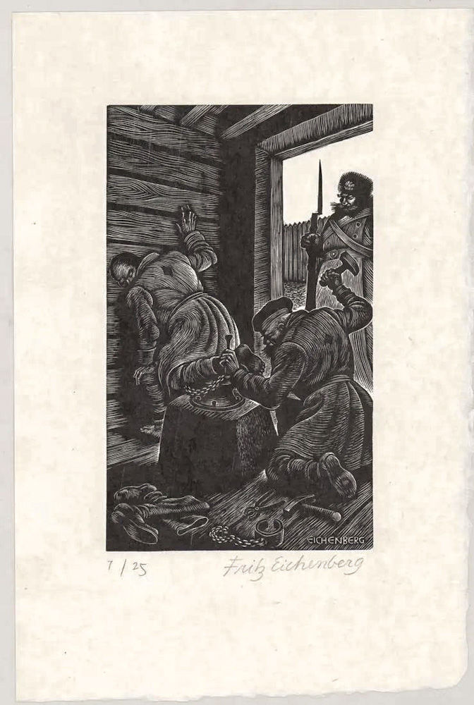 [New York]: [Limited Editions Club], [1982]. Hardcover. Fine in a Fine case. Fritz Eichenberg. Complete collection of 10 SIGNED wood engravings (7-3/4" x 11-3/4") by Fritz Eichenberg used to illustrate the Limited Editions Club edition of Dostoevsky's THE HOUSE OF THE DEAD, here presented as loose engravings individually SIGNED and numbered 7 of only 25 sets produced. Laid into a black cloth-backed folder with marbled boards and gilt lettering on the spine. Though there is no indication of such, this came from the artist's estate.
