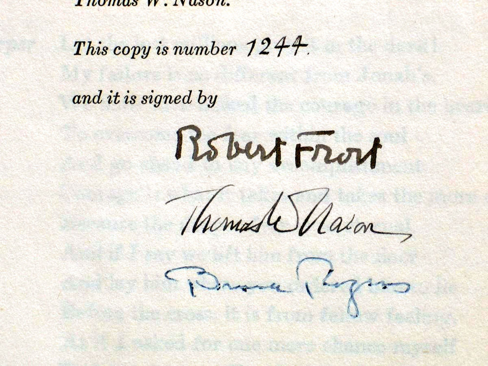 New York: Limited Editions Club, 1950. First Edition. Hardcover. Tasteful bookplate on each front pastedown; contents bright and fresh. Close to Fine in a Very Good slipcase with some splitting at top and bottom edges. Thomas Nason. Two large octavo (7-3/4" x 11") volumes bound in full blue denim with new black leather labels stamped in gold. Copy #1244 of 1500 copies illustrated with wood engravings by Thomas Nason, perhaps Frost's most sympathetic illustrator, and designed by Bruce Rogers. SIGNED by the poet, the illustrator, and the designer of the book on the colophon page. The most beautiful of the several issues of this great poet's complete works. Uncommon Monthly Letter laid in.
