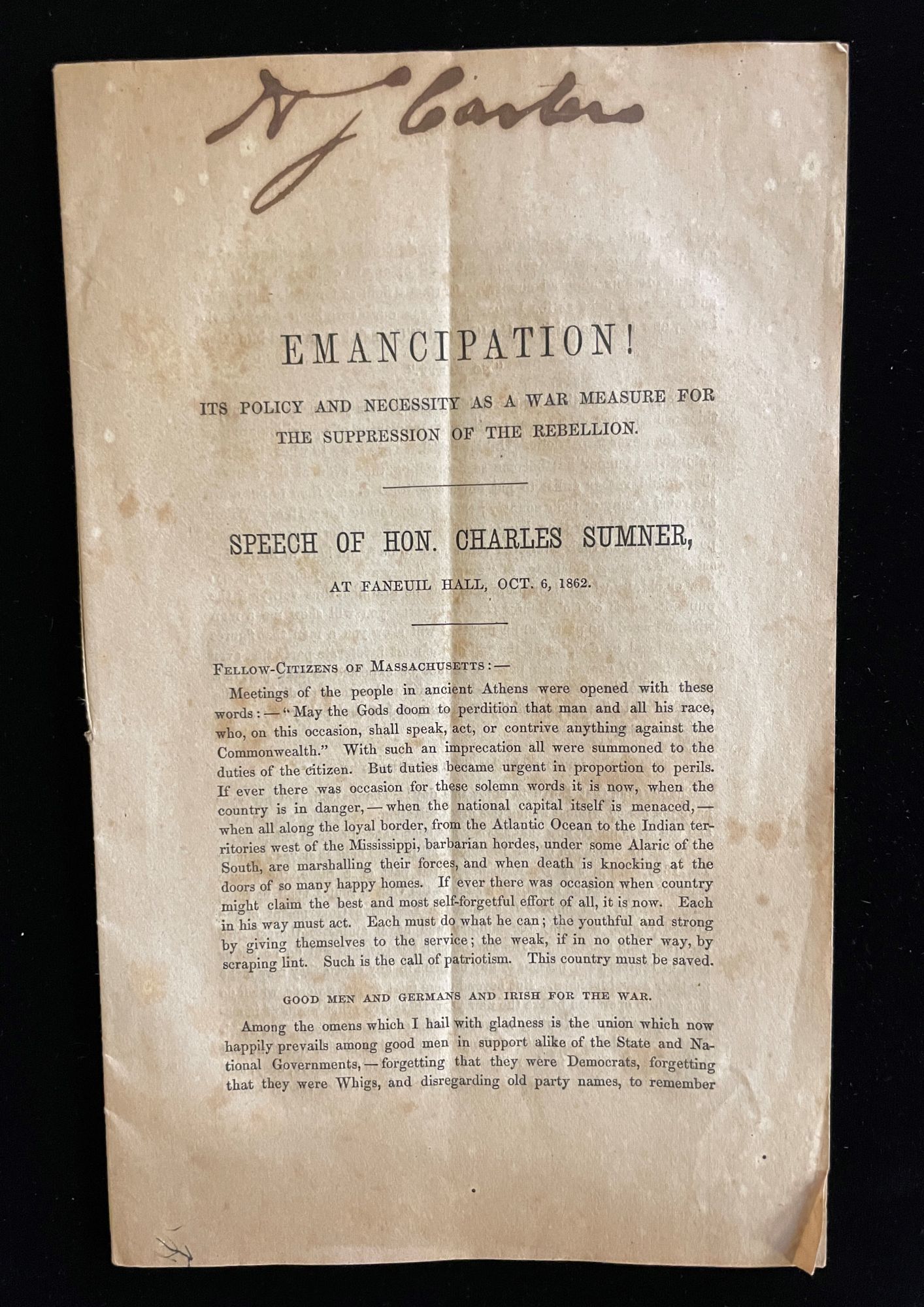 (Boston): unidenitified, 1862. Soft cover. Very Good. Original pamphlet printed in Boston in 186, speech given by Sumnber at Fanueiil Hall on Oct 6, 1862. Measures 14 x 22.5 cm, 23 page, string tied, very nice condition, with (presumably) original or early owner name top of front cover (title page). Uncommon in the marketplace these days. Major Abolitionist rallying cry for freeing slaves so they couid join the Union and battle the Confederacy.With the outbreak of the Civil War in 1861,Sumner forced himself into the inner circle of Abraham Lincoln. He encouraged the President to issue the Emancipation Proclamation, advocated for the creation of all-Black regiments, and played a key role in the passage of the 13th Amendment in the Senate. CIVIL WAR. UNION. CONFEDERACY SLAVERY Uncommon in the marketplace these days.